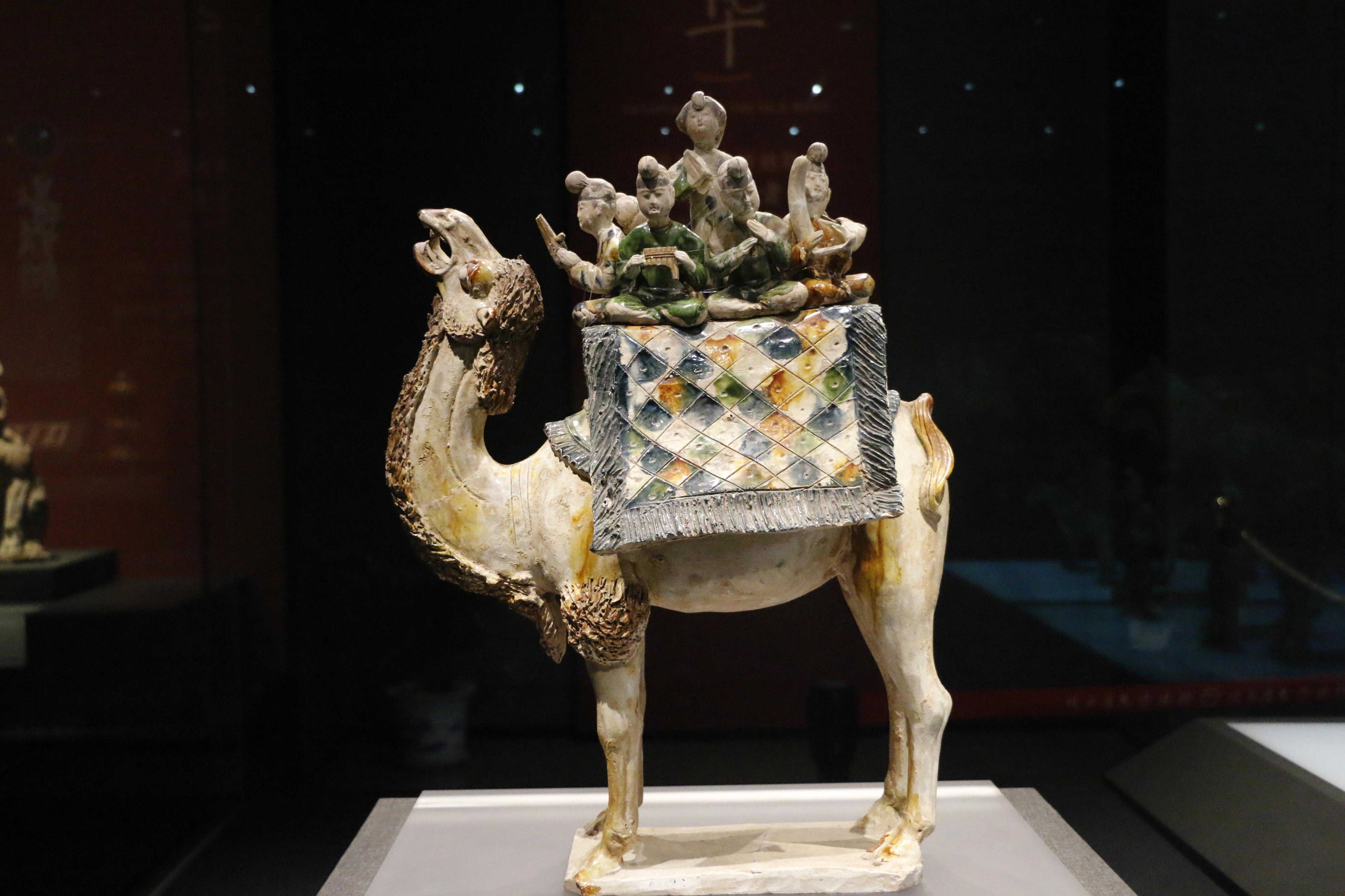 和唐三彩骆驼载乐俑鼓乐吹笙的场面