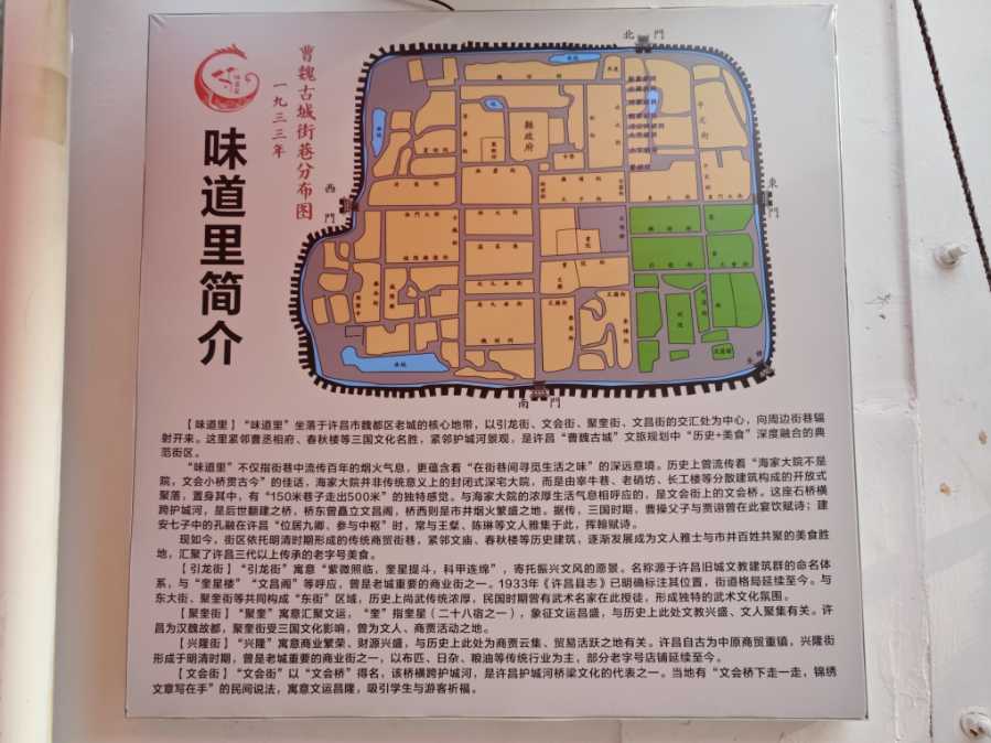 “味道里”位于魏都区老城核心区域,以引龙街、文会街、聚奎街交会处为中心,辐射周边街巷。这里紧邻曹丞相府、春秋楼等三国文化景点,与护城河景观带仅百米之遥,是许昌“曹魏古城”文旅规划中“历史+美食”融合的示范街区。在许昌,如果你想吃烧鸡、涮羊肉、炝锅面、壮馍、油酥火烧、油茶、胡辣汤、水煎包等美食,来“味道里”可“一站式”满足你的愿望。