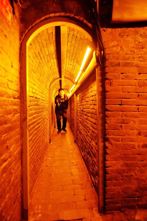 运兵道主体以青砖砌筑,高约1.8米,宽0.7米,纵横交错形成立体交通体系。其构造尽显军事智慧:通道内设有双层道、绊腿板、猫耳洞等防御工事,通风口巧妙融入民宅水井,指挥室、陷阱、瞭望孔等设施一应俱全。