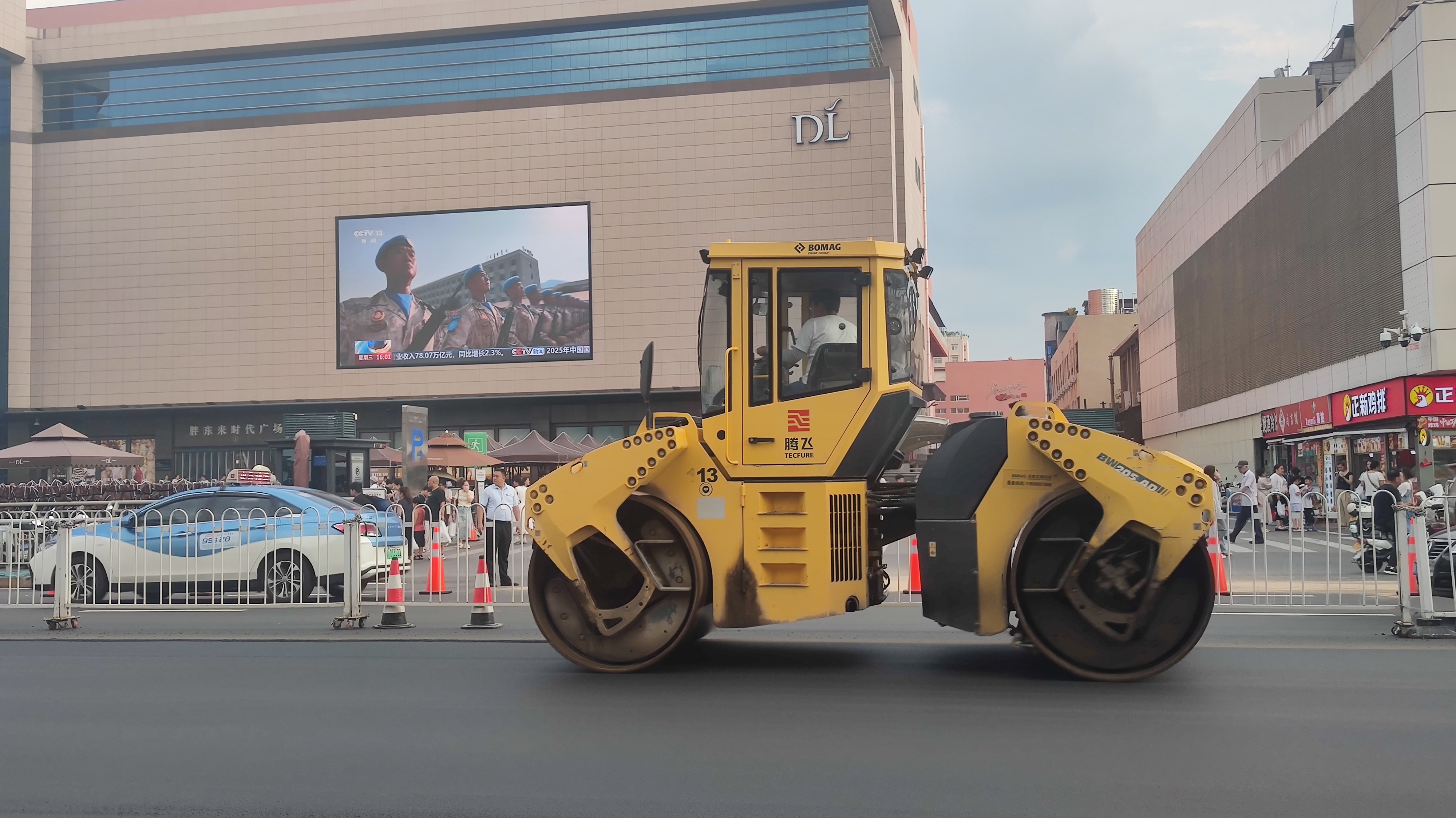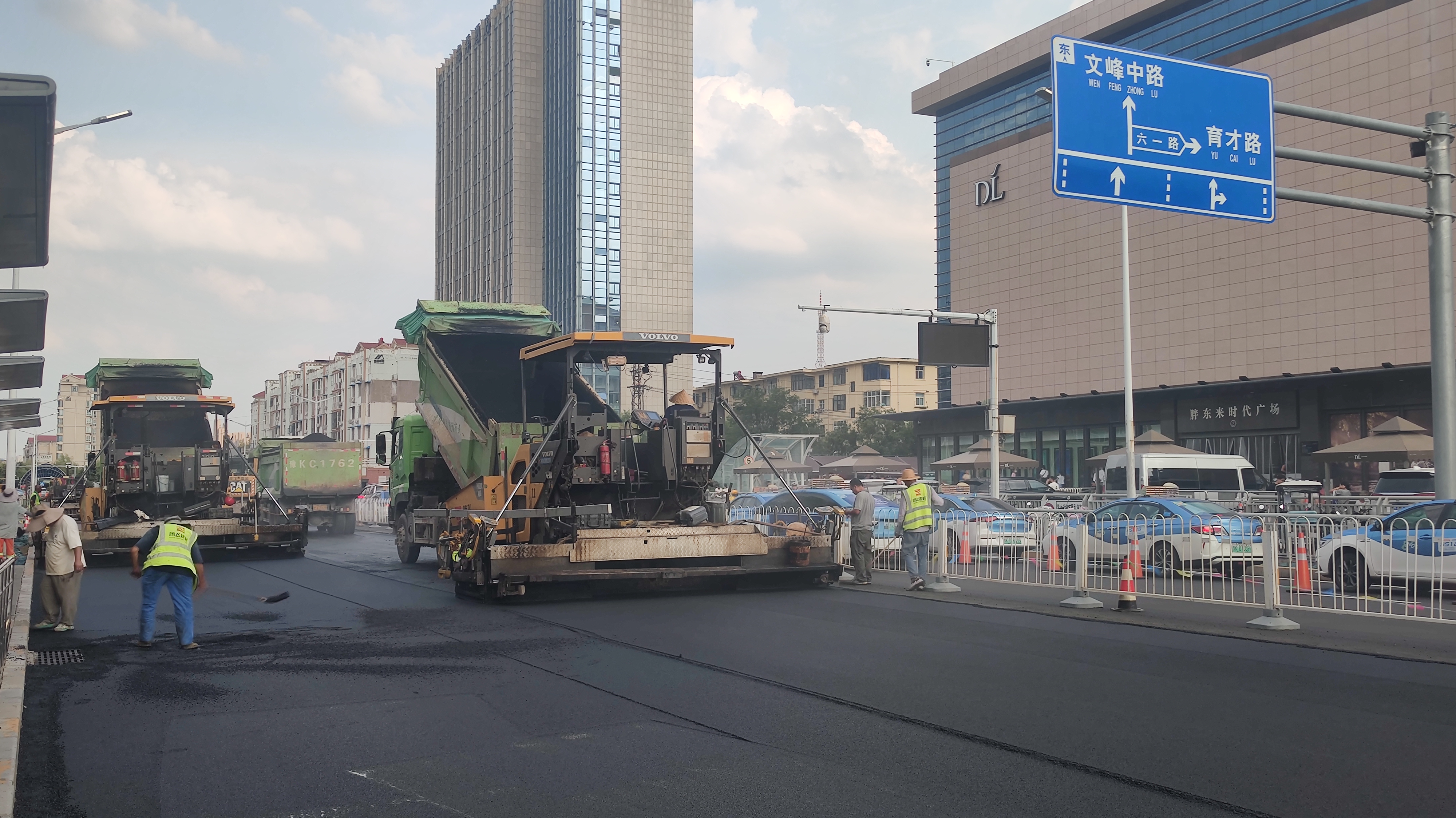 记者在施工现场看到,沥青摊铺机、双钢轮压路机、轮胎压路机等来回穿梭,施工现场繁忙而有序。