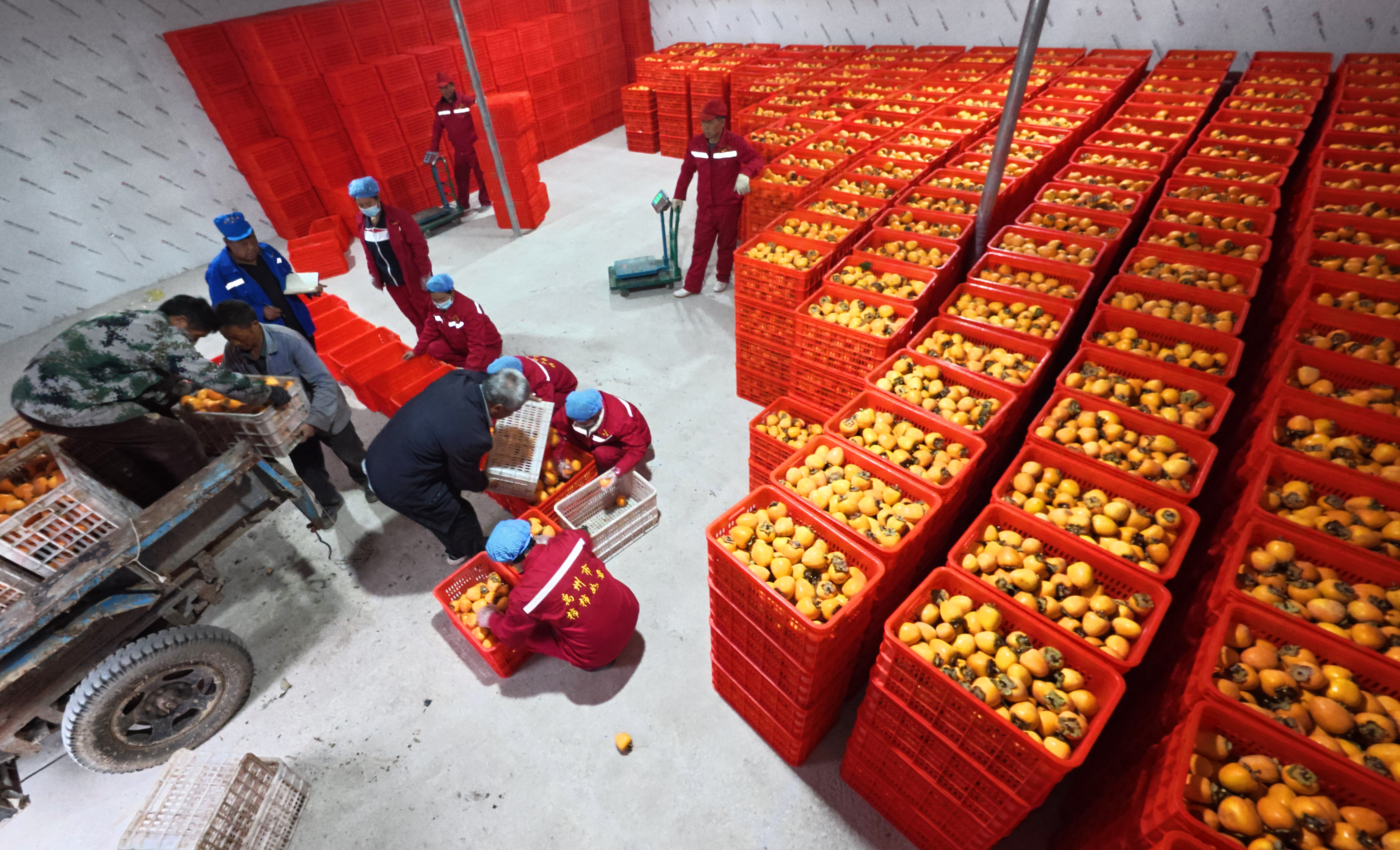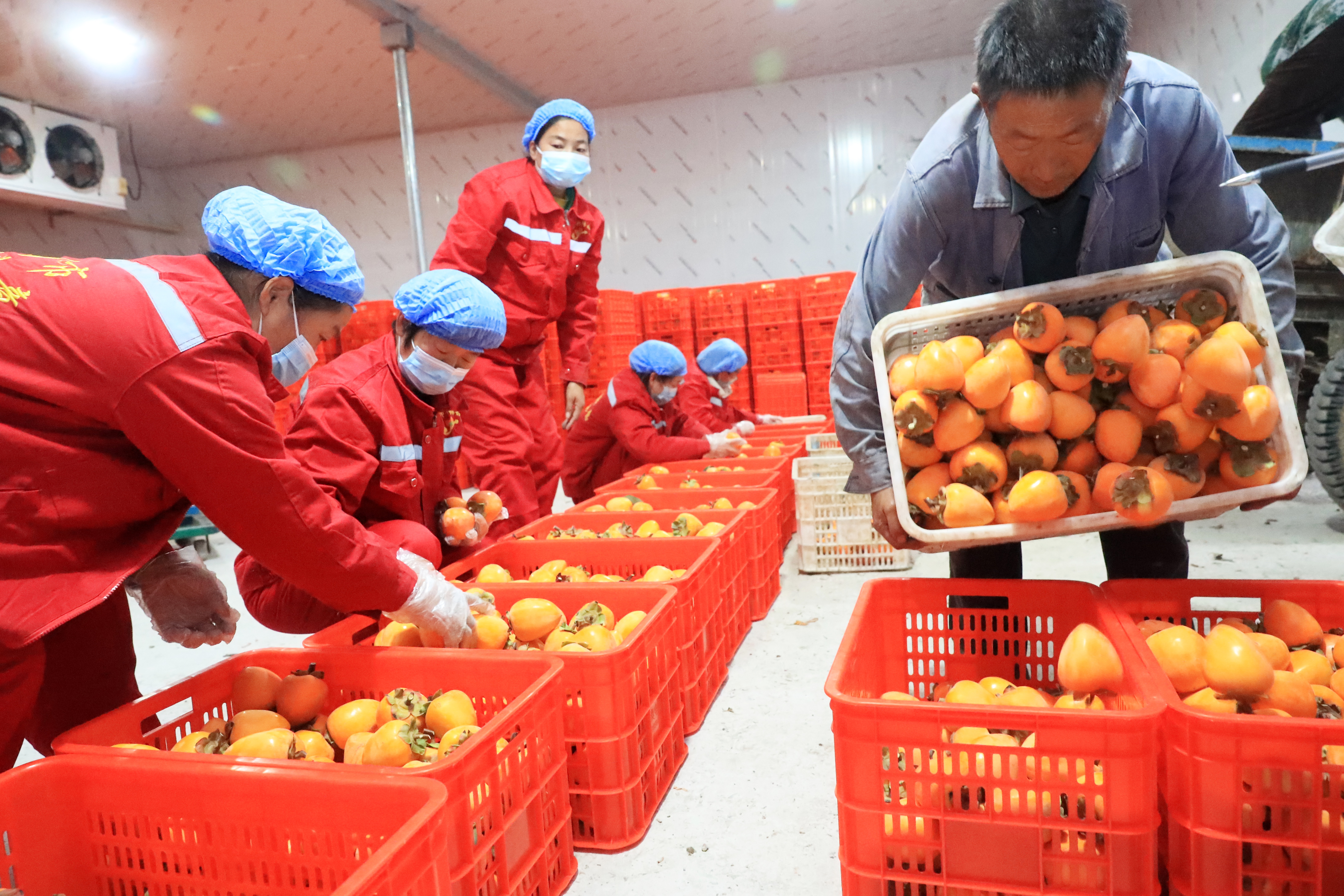 10月29日,村民在禹州市磨街乡刘门村的加工厂冷库内储藏柿子。