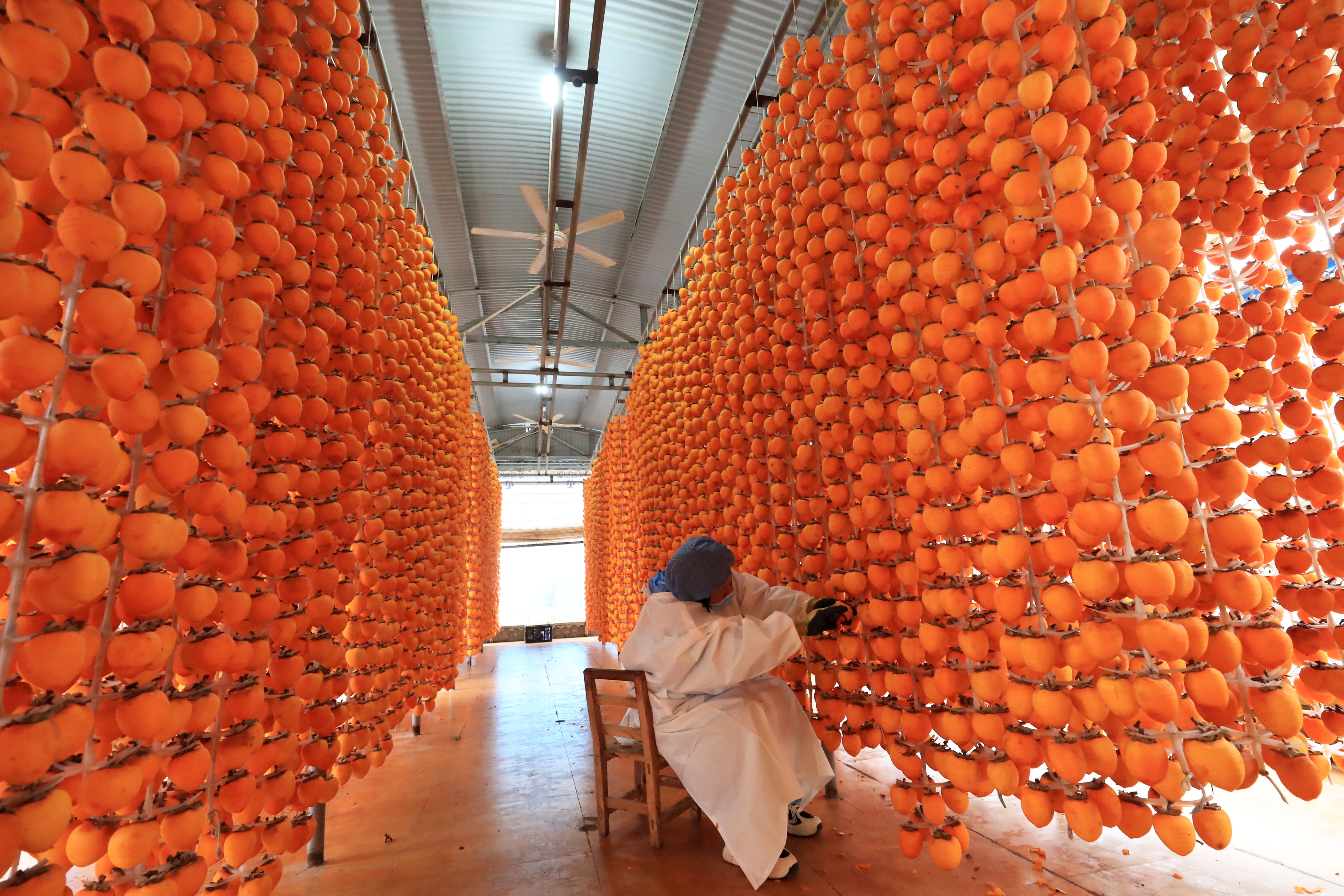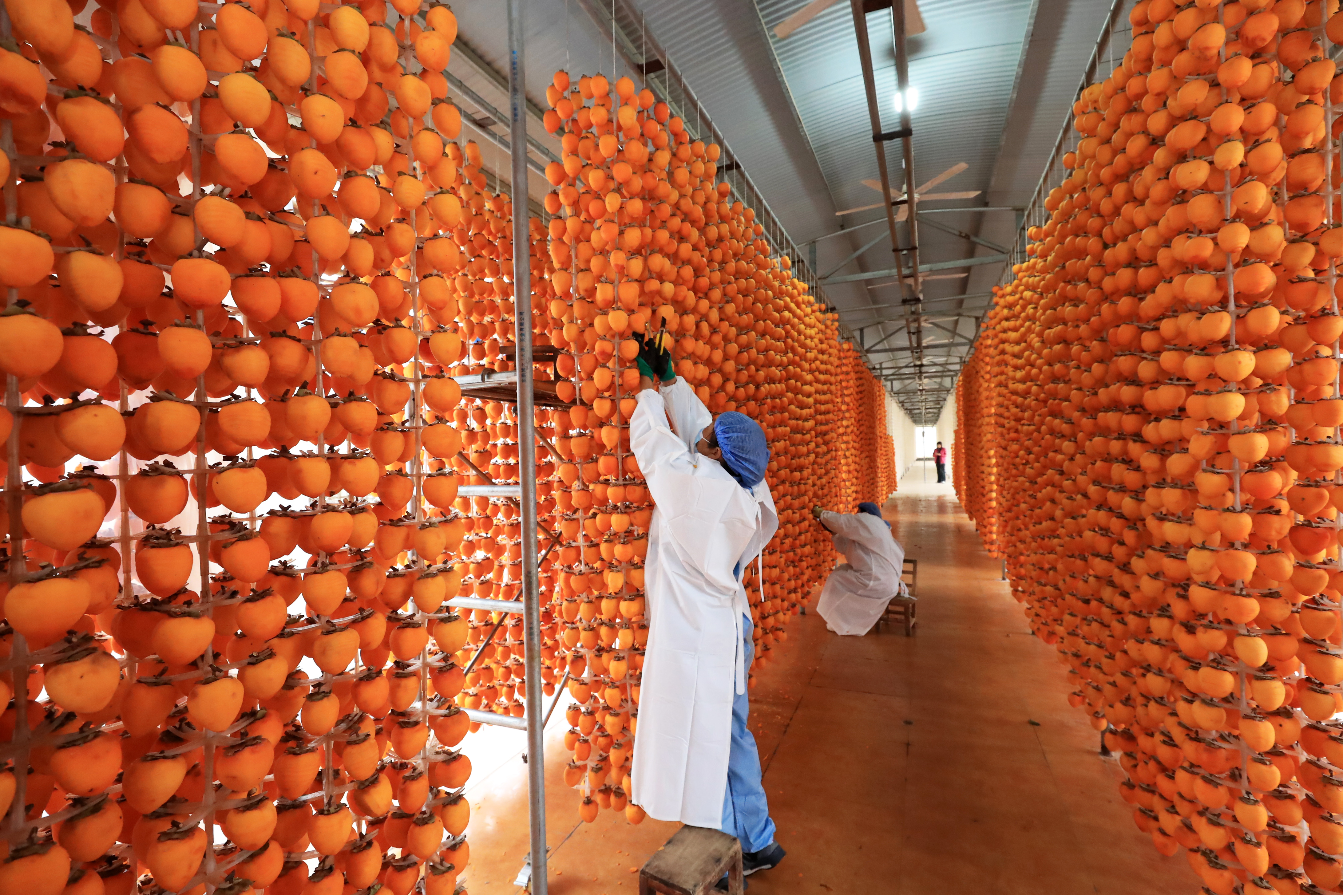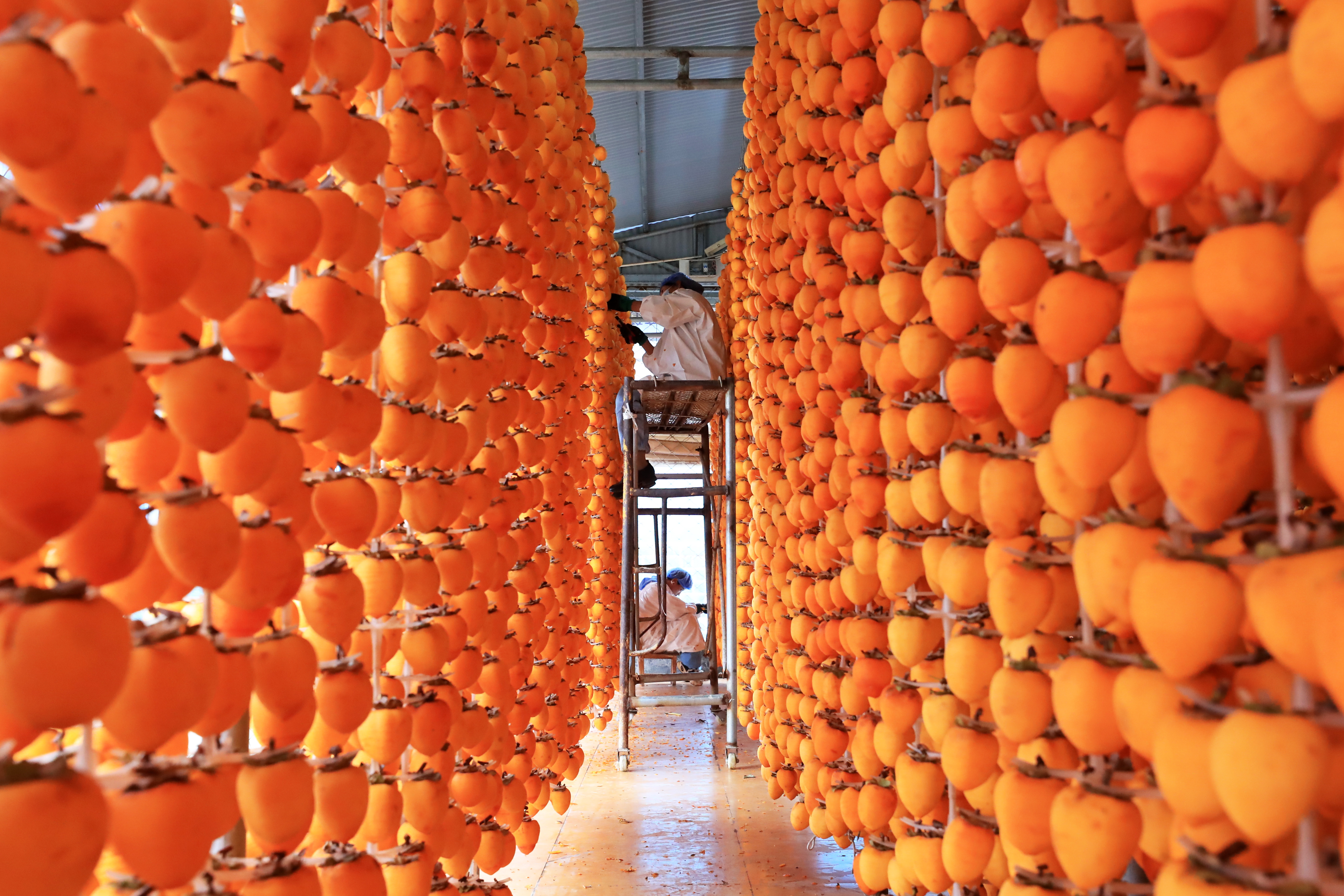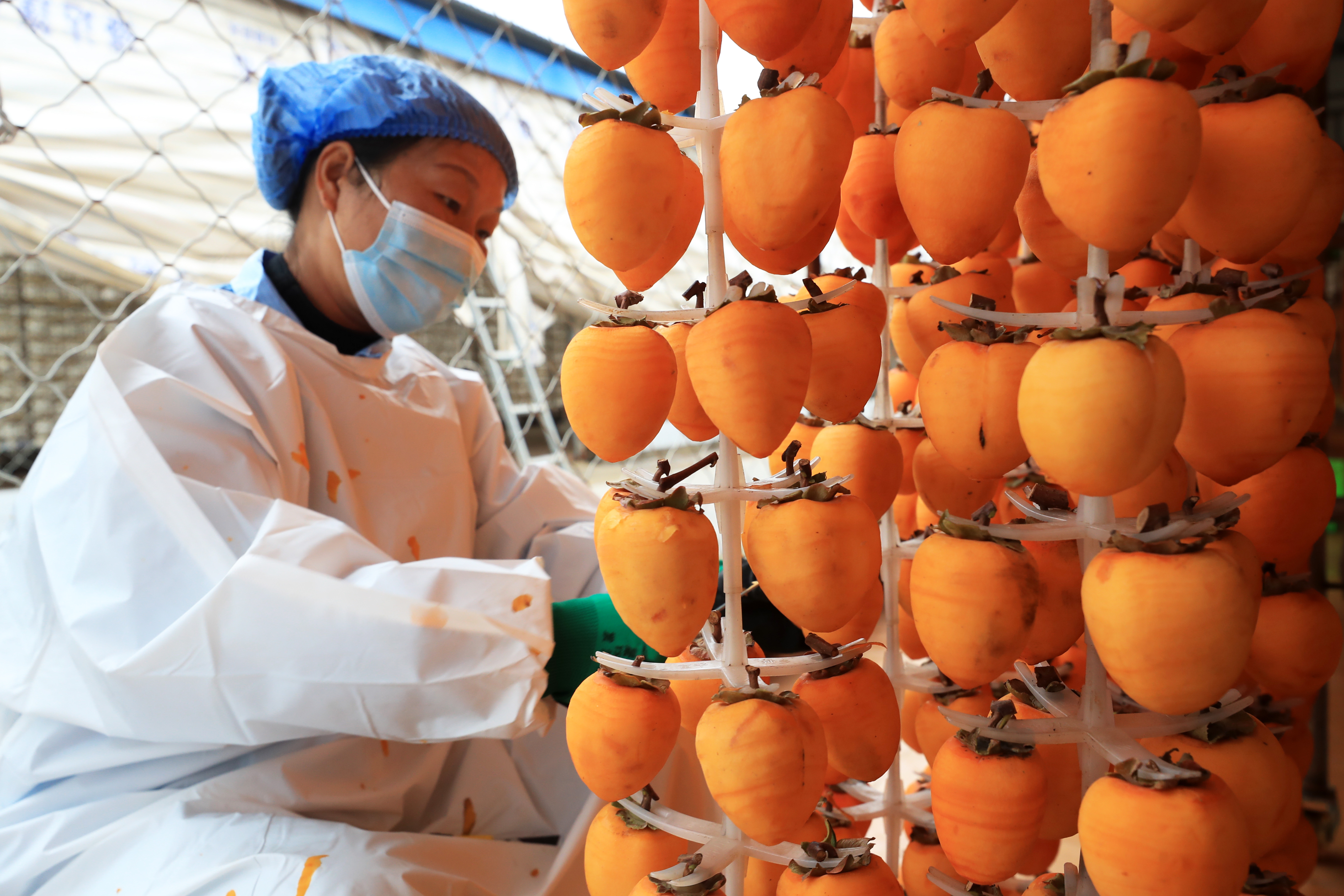 10月29日,村民在禹州市磨街乡刘门村的加工厂里吊挂柿子,准备制作柿饼。