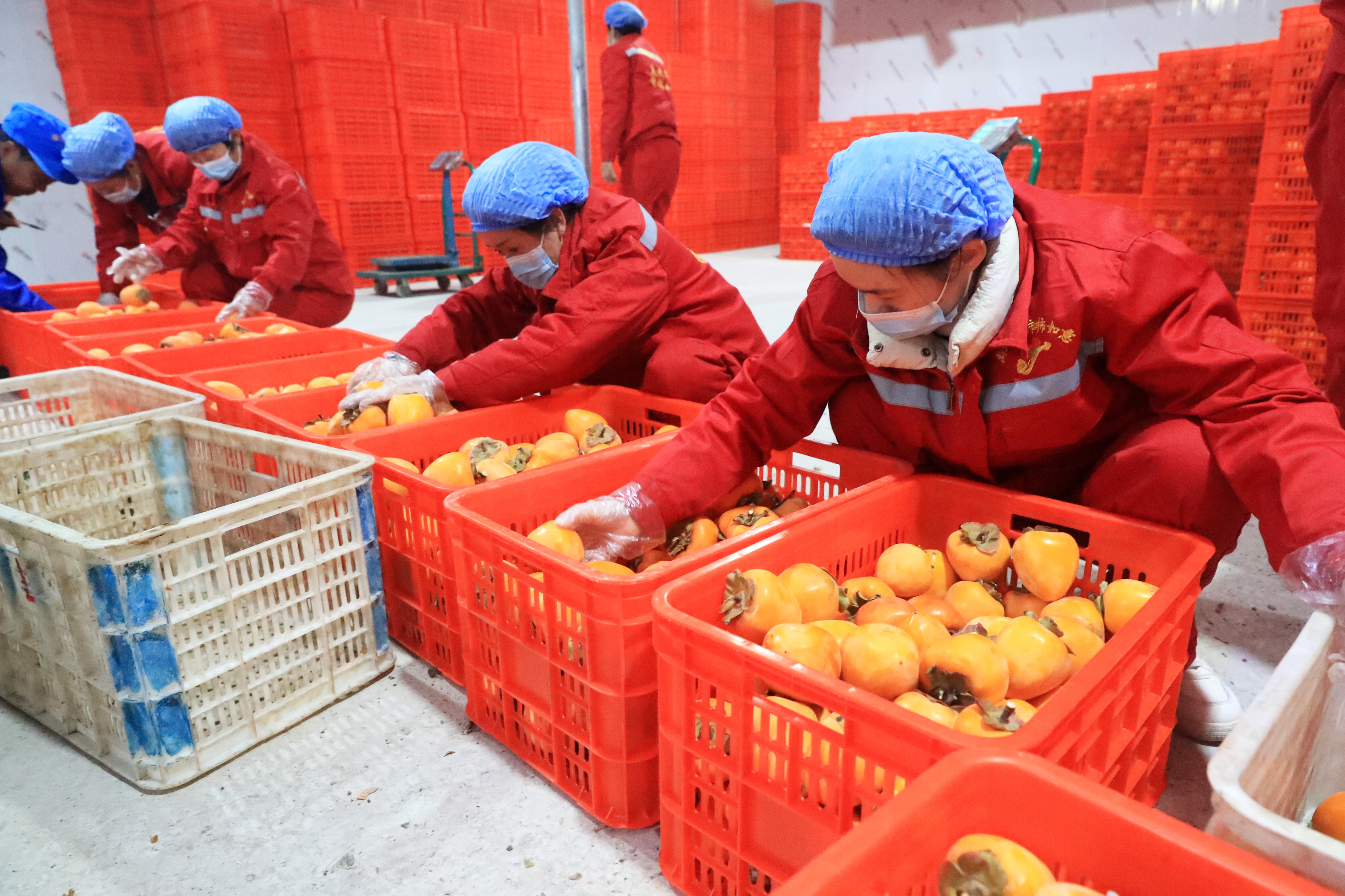 10月29日,村民在禹州市磨街乡刘门村的加工厂冷库内分拣冷藏柿子。