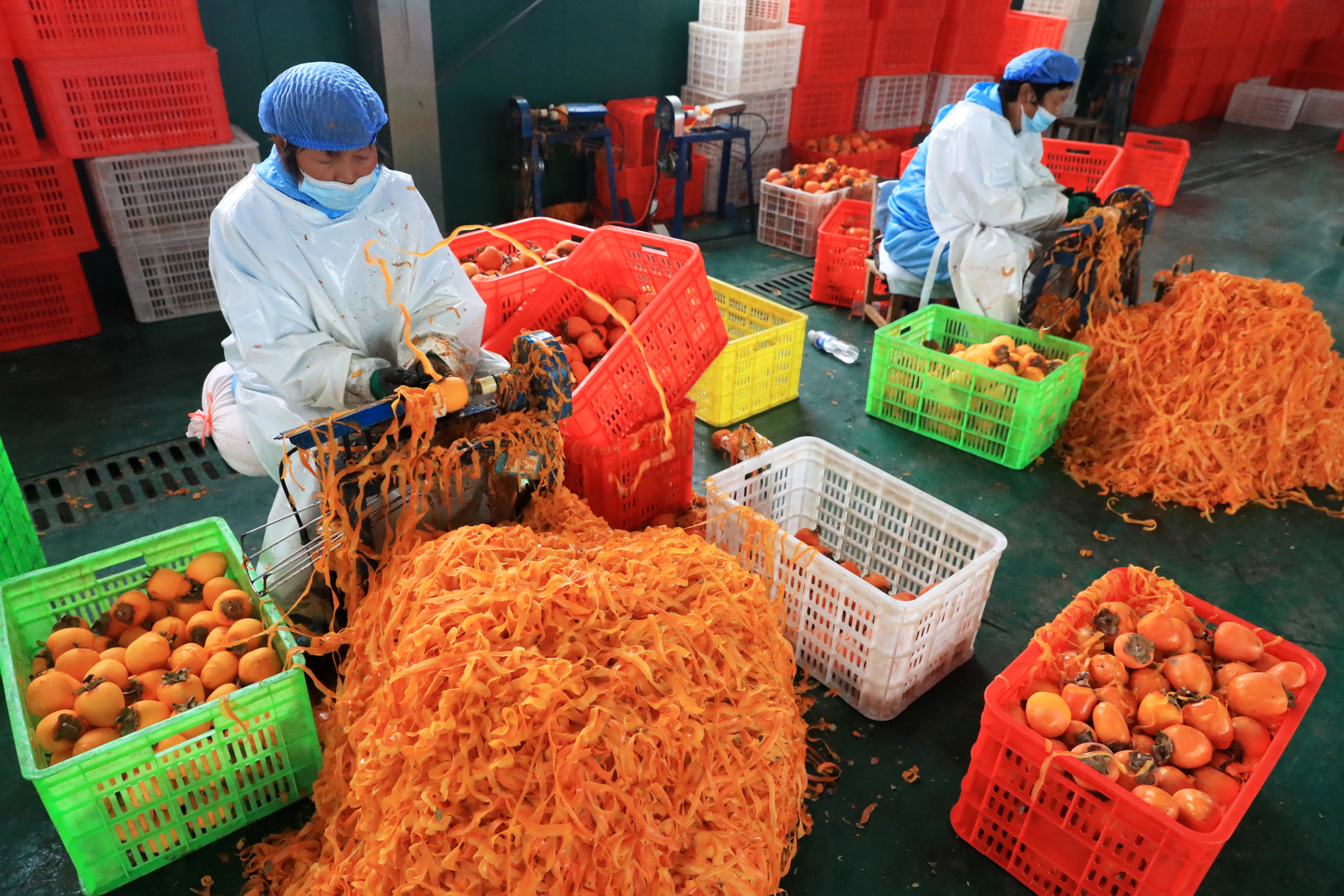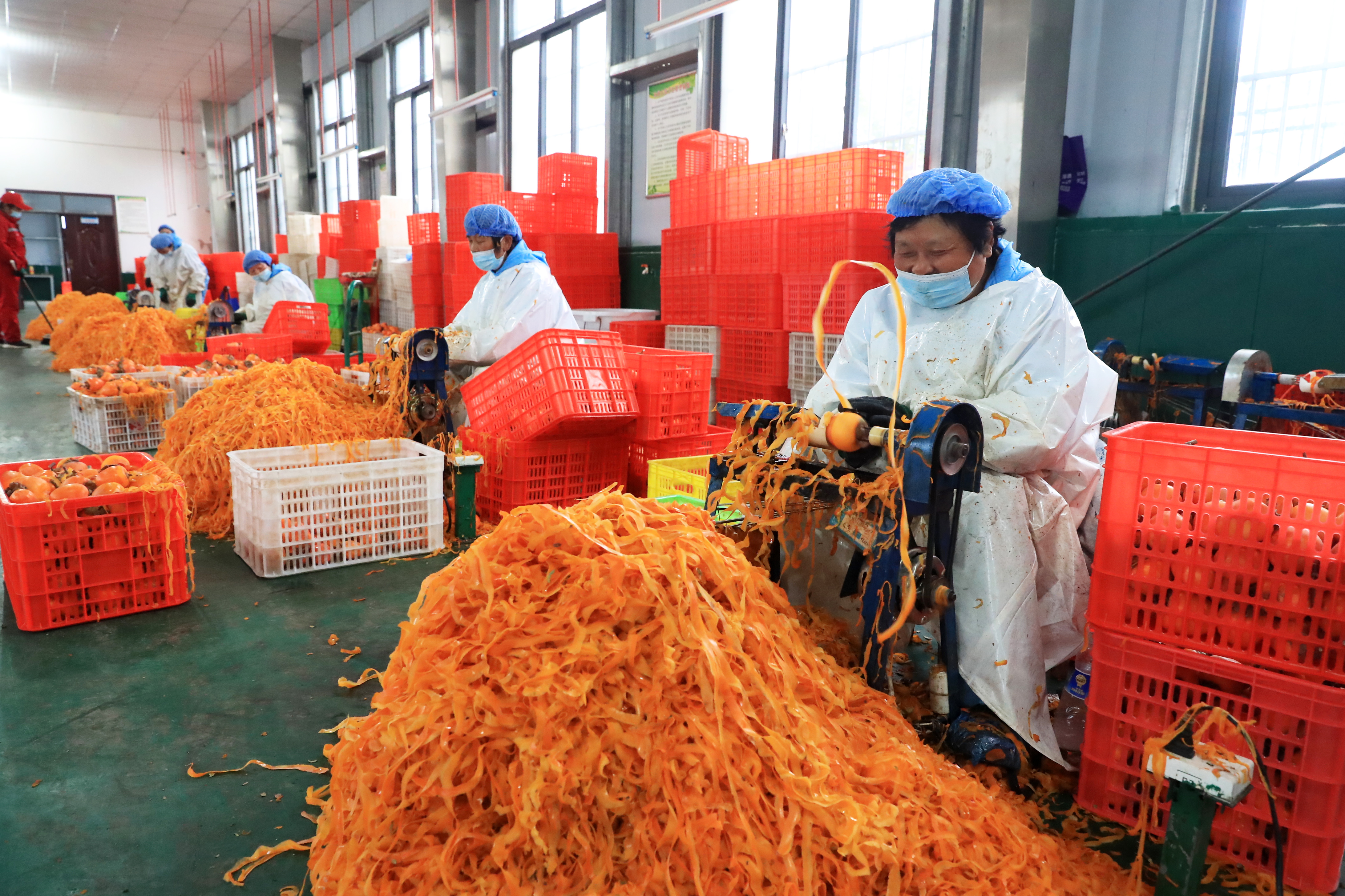 10月29日,村民在禹州市磨街乡刘门村的加工厂里给柿子削皮。