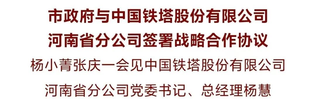 12月4日,市政府与中国铁塔股份有限公司河南省分公司签署战略合作协议。市委书记杨小菁、市长张庆一会见河南铁塔党委书记、总经理杨慧,并共同见证签约。