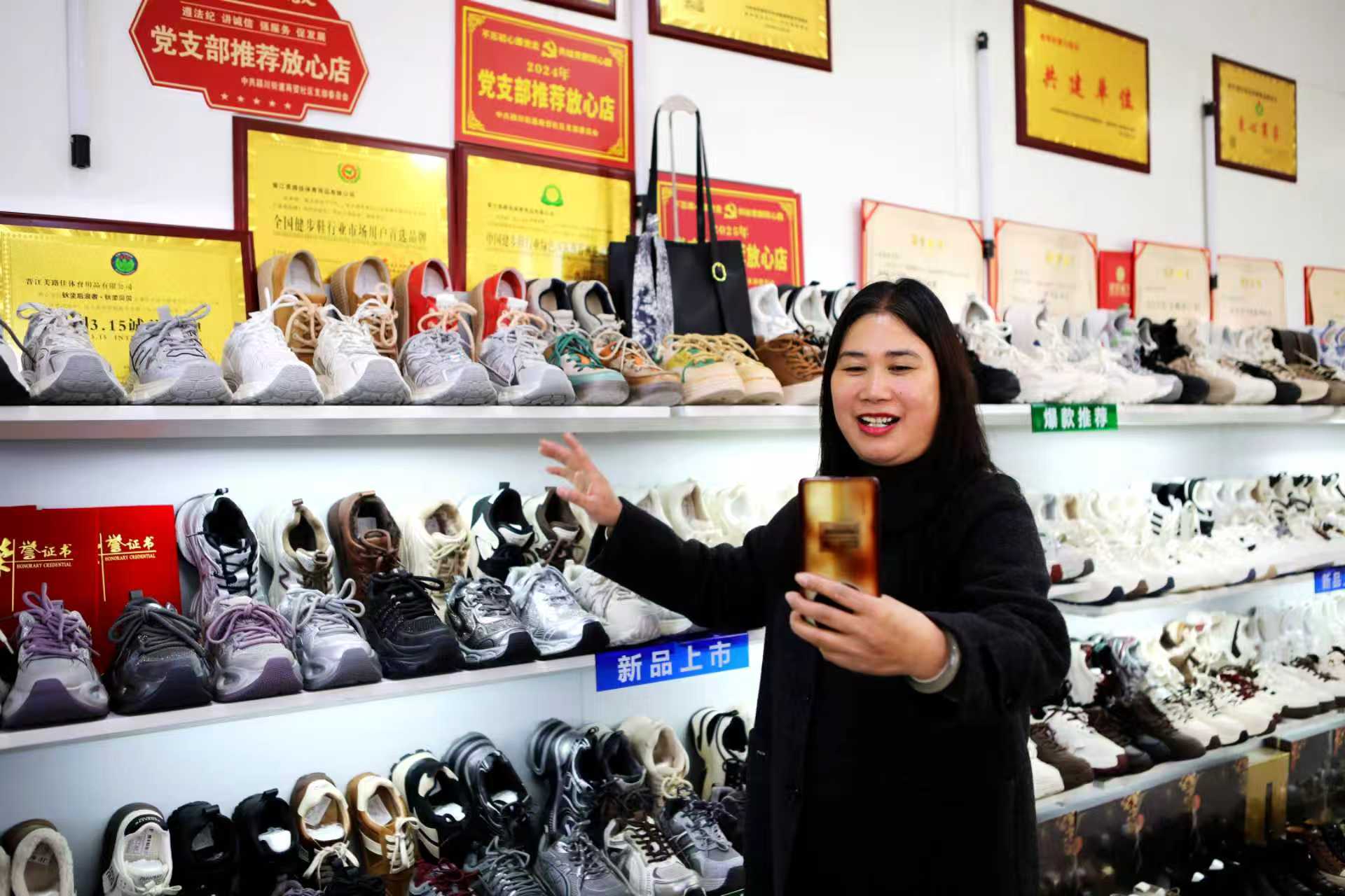 从实体店到“云端”,经营鞋店已有20多年的张慧丽面对镜头尽管有些紧张,但她依然愿意尝试,而且也收到了不错的效果。“我的分店正在装修,鞋店营业额也逐年递增。”下播后,张慧丽和商贸社区党支部书记田荔嘉交谈着,对未来充满了信心。