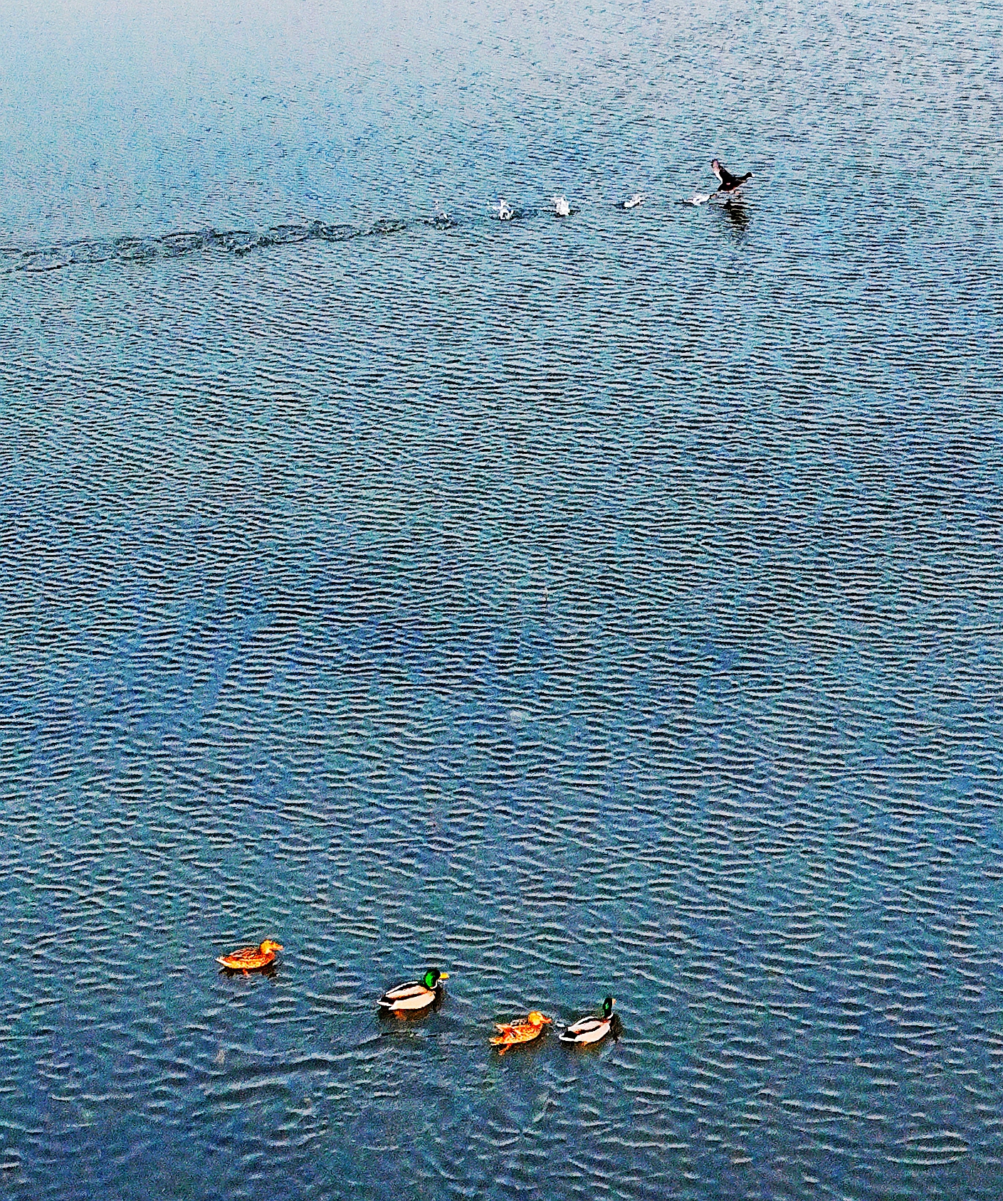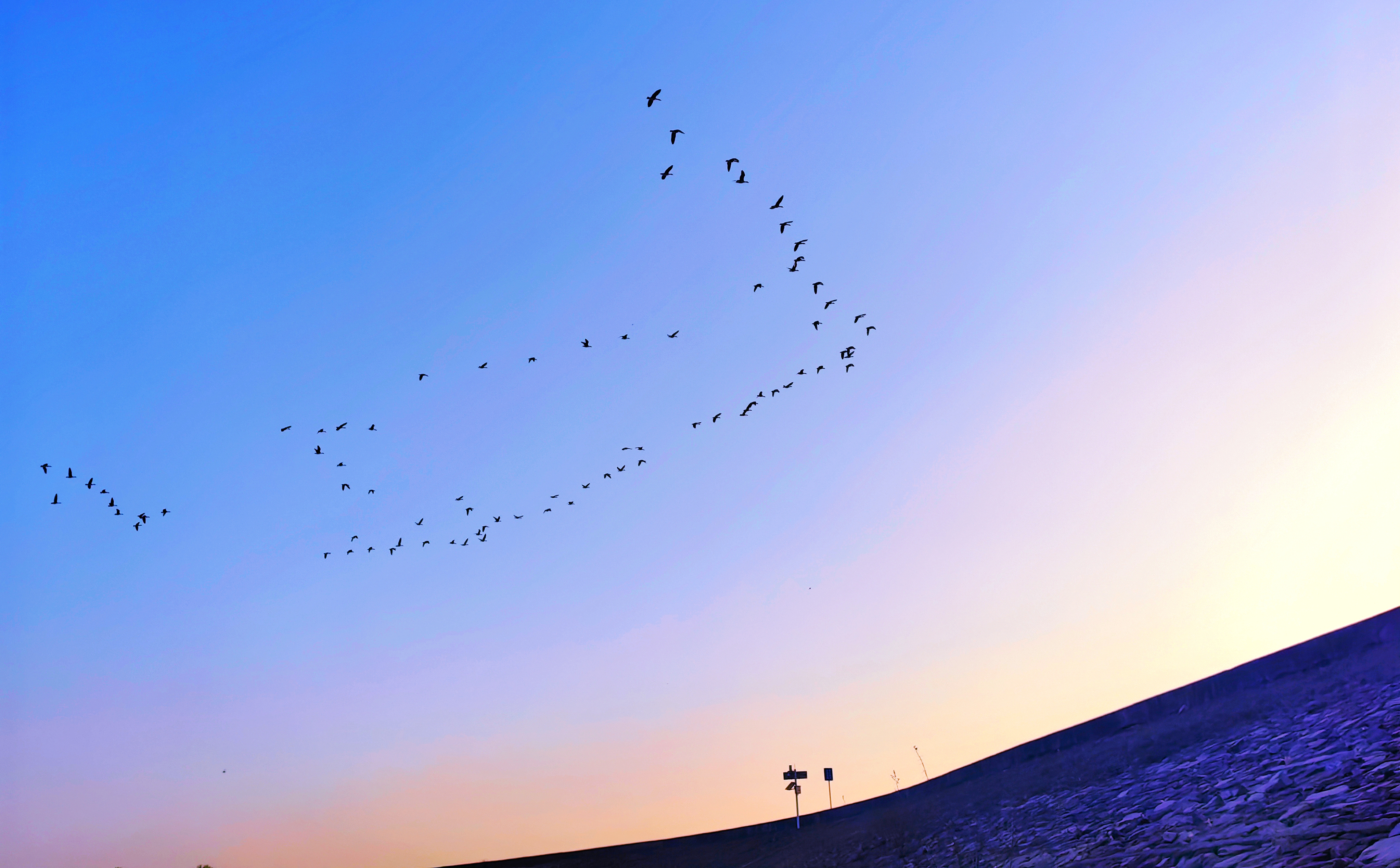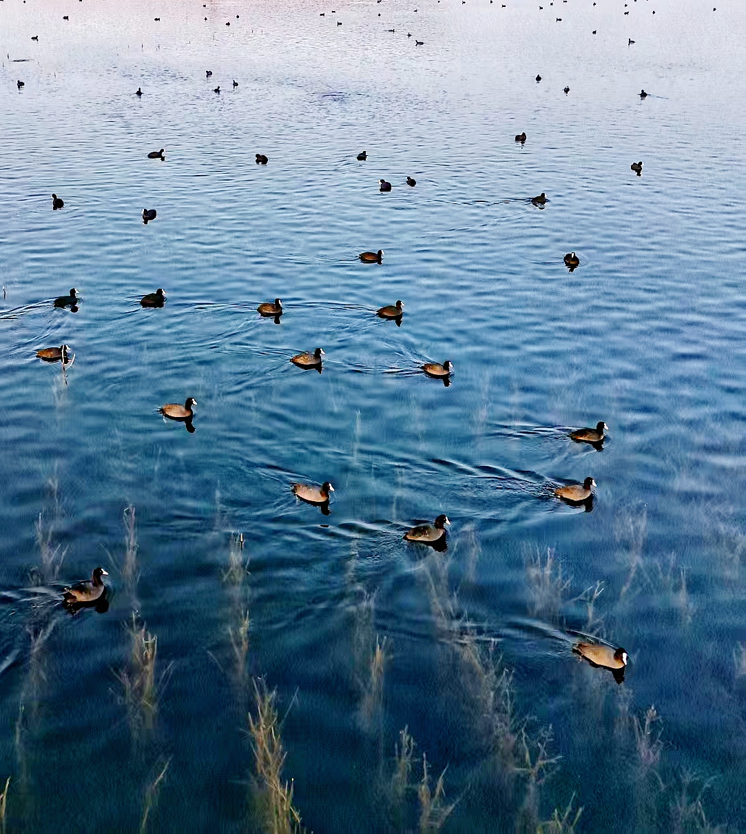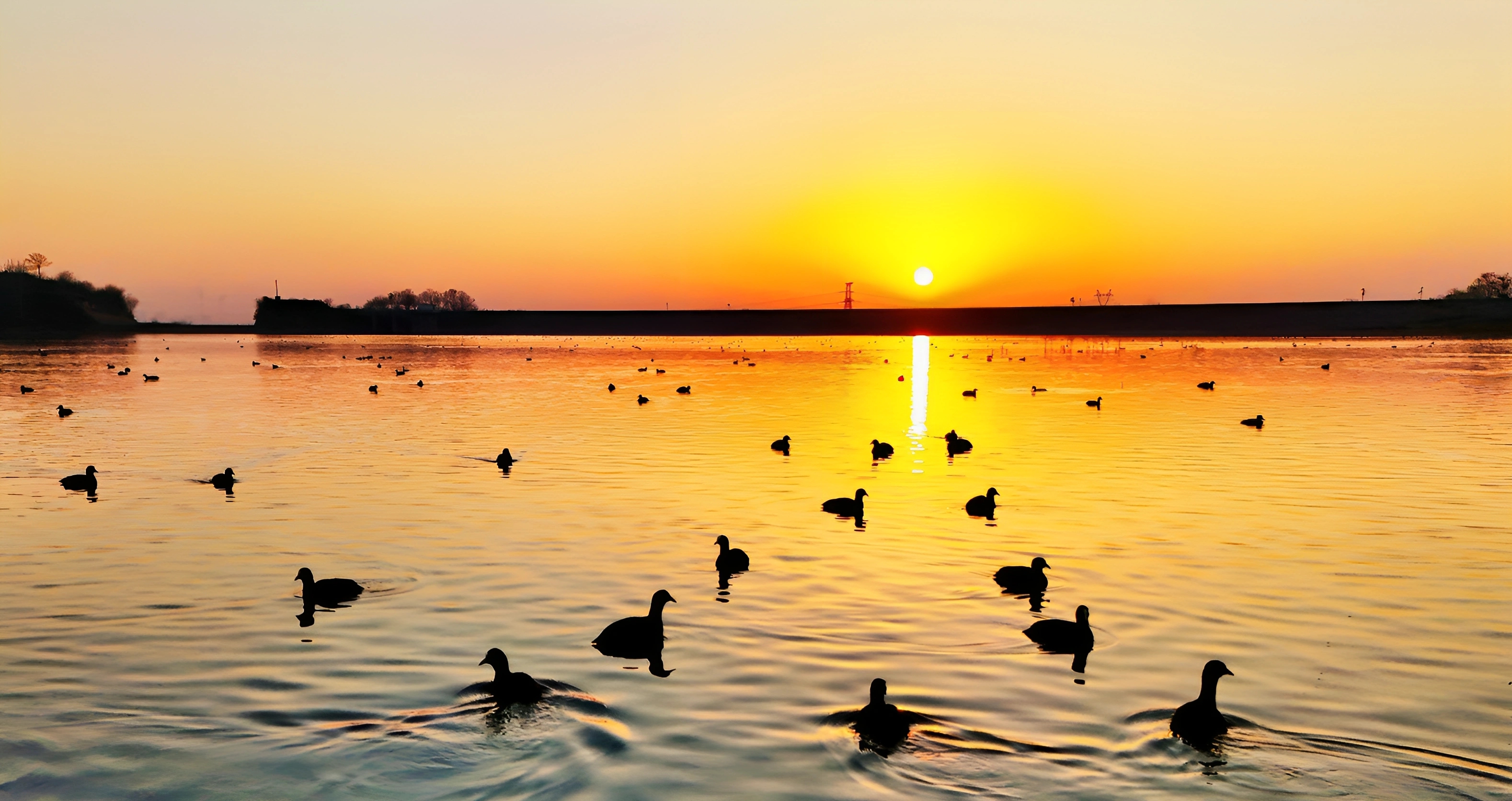 12月16日,冬日暖阳洒满禹州市朱阁镇郑湾水库,山岗间回荡着清脆鸟鸣,奏响了冬日生态欢歌。天空中,成群大雁舒展翅膀,时而盘旋翱翔,引颈长鸣,时而轻落水面,漾起粼粼波光。清澈的湖面上,斑嘴鸭结队游弋、低头觅食,灵动身影与湛蓝天空、金黄岸线相映成趣,勾勒出一幅和谐共生的冬日画卷。