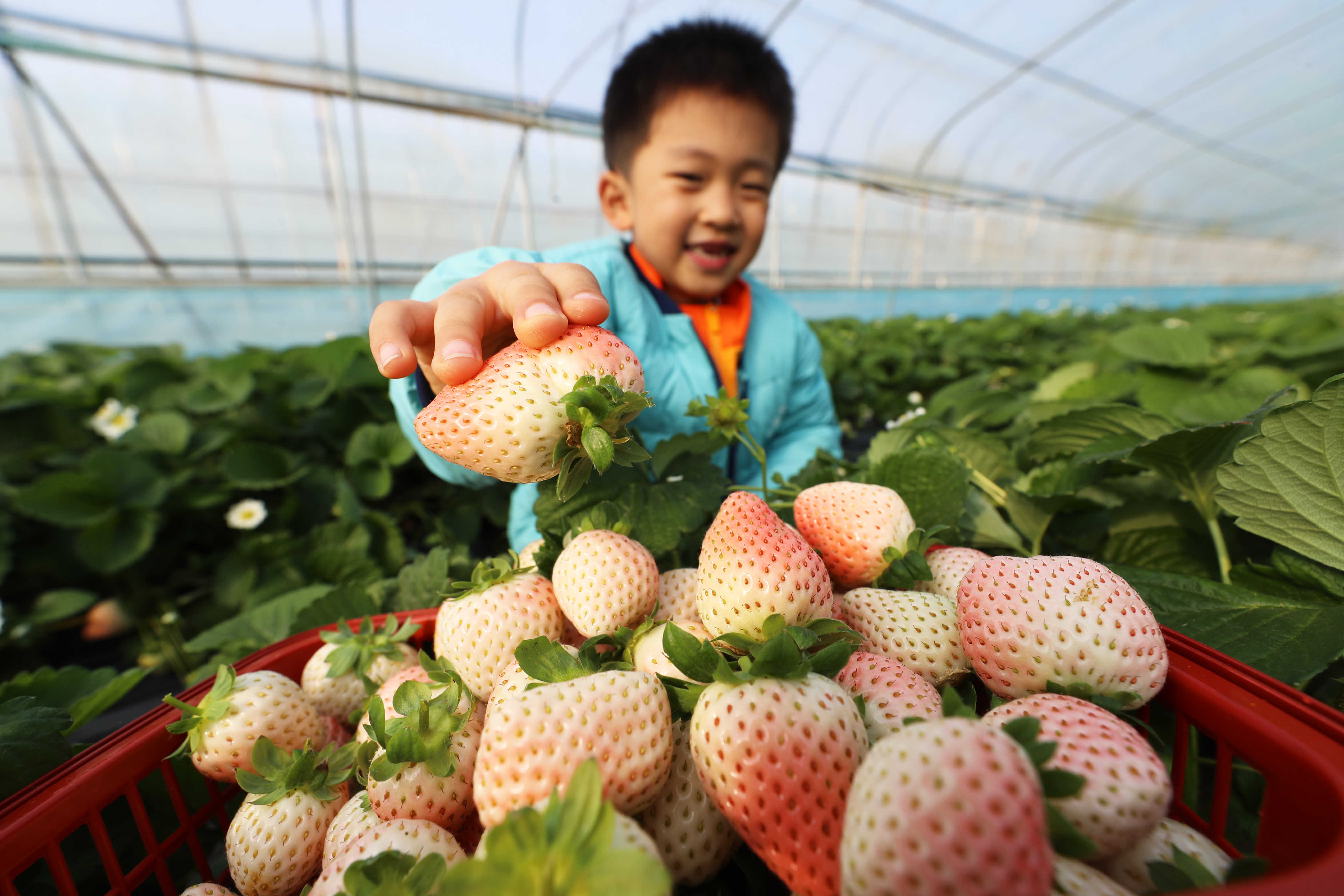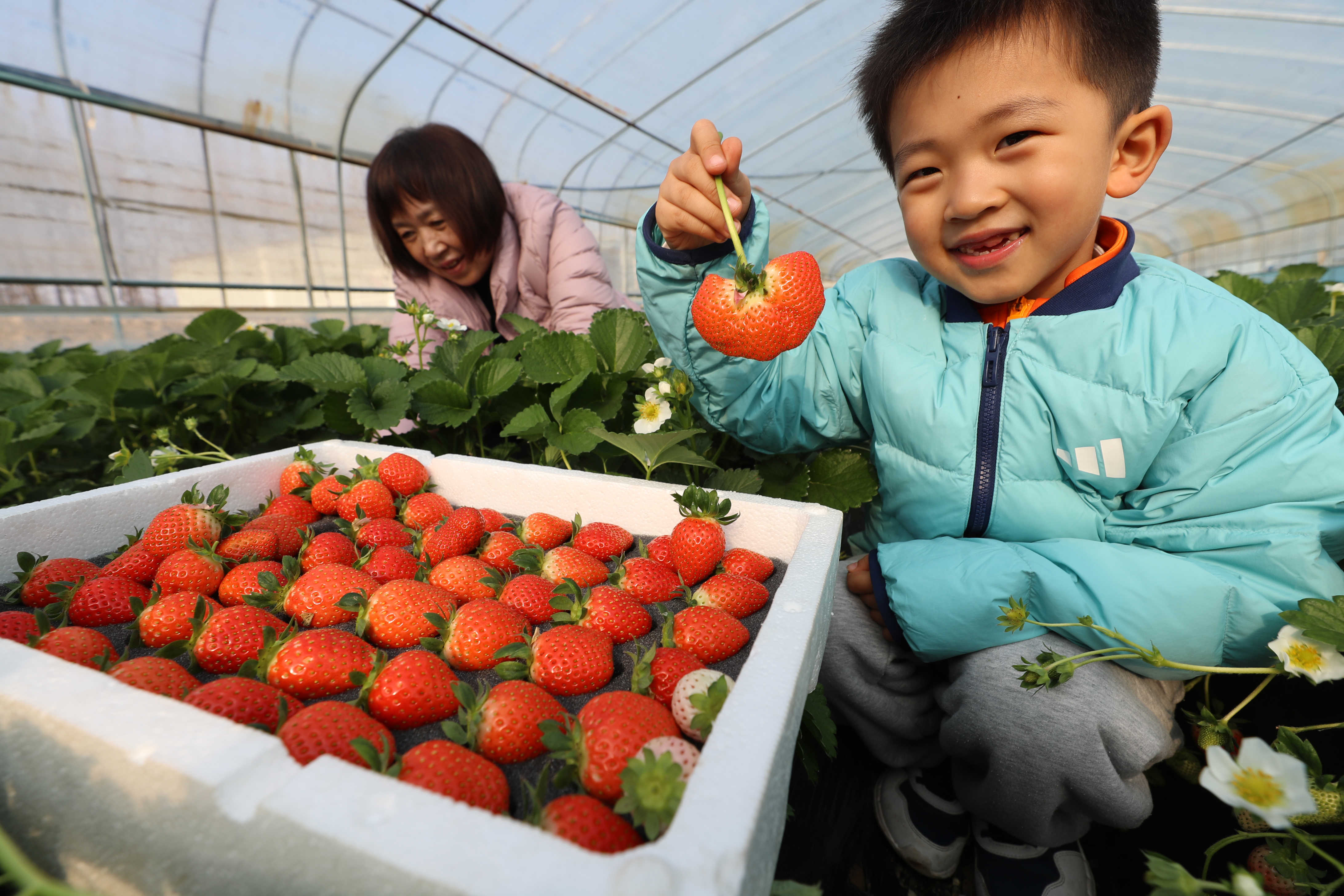 12月17日,一位小朋友在建安区五女店镇勤劳农夫草莓园采摘草莓。