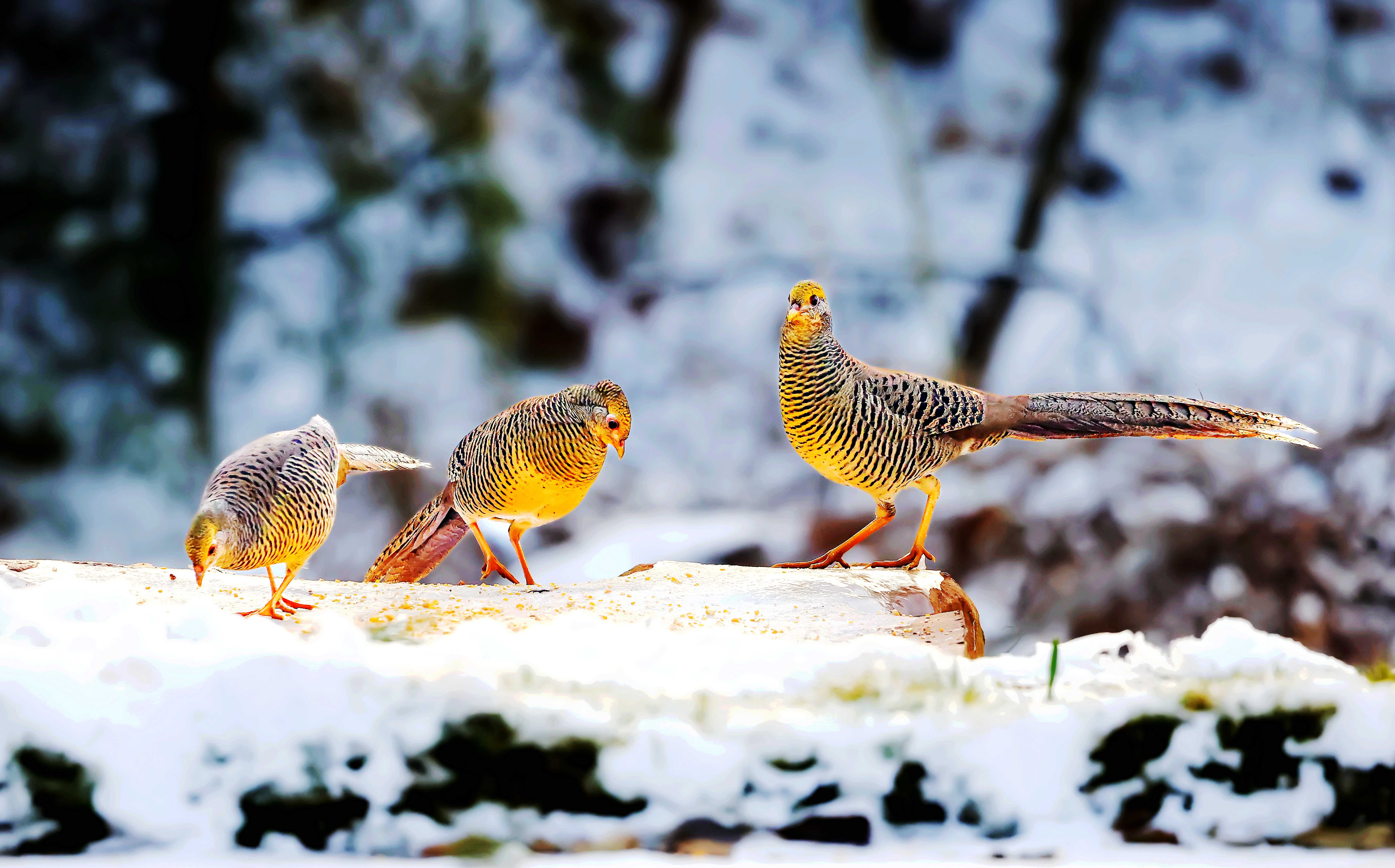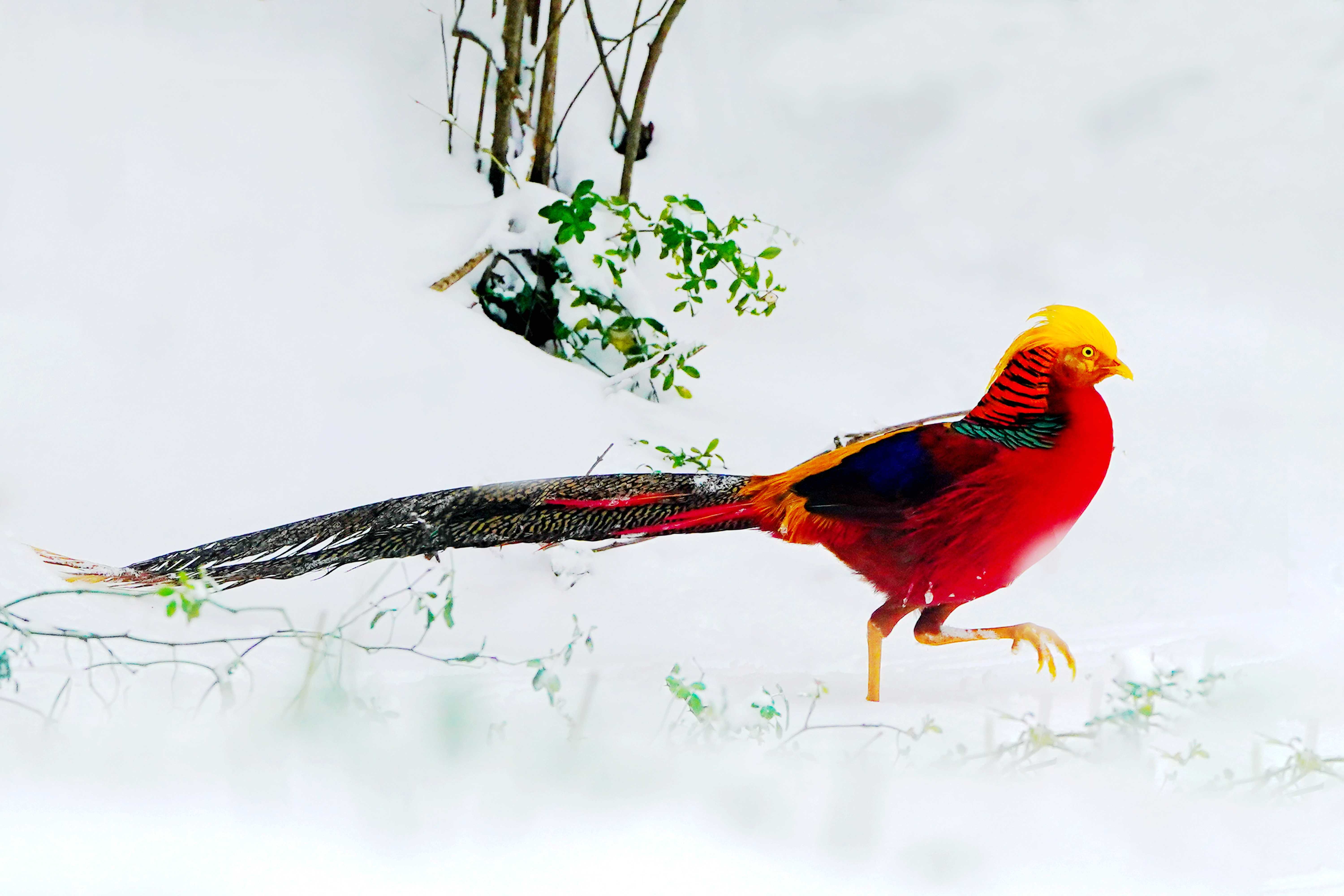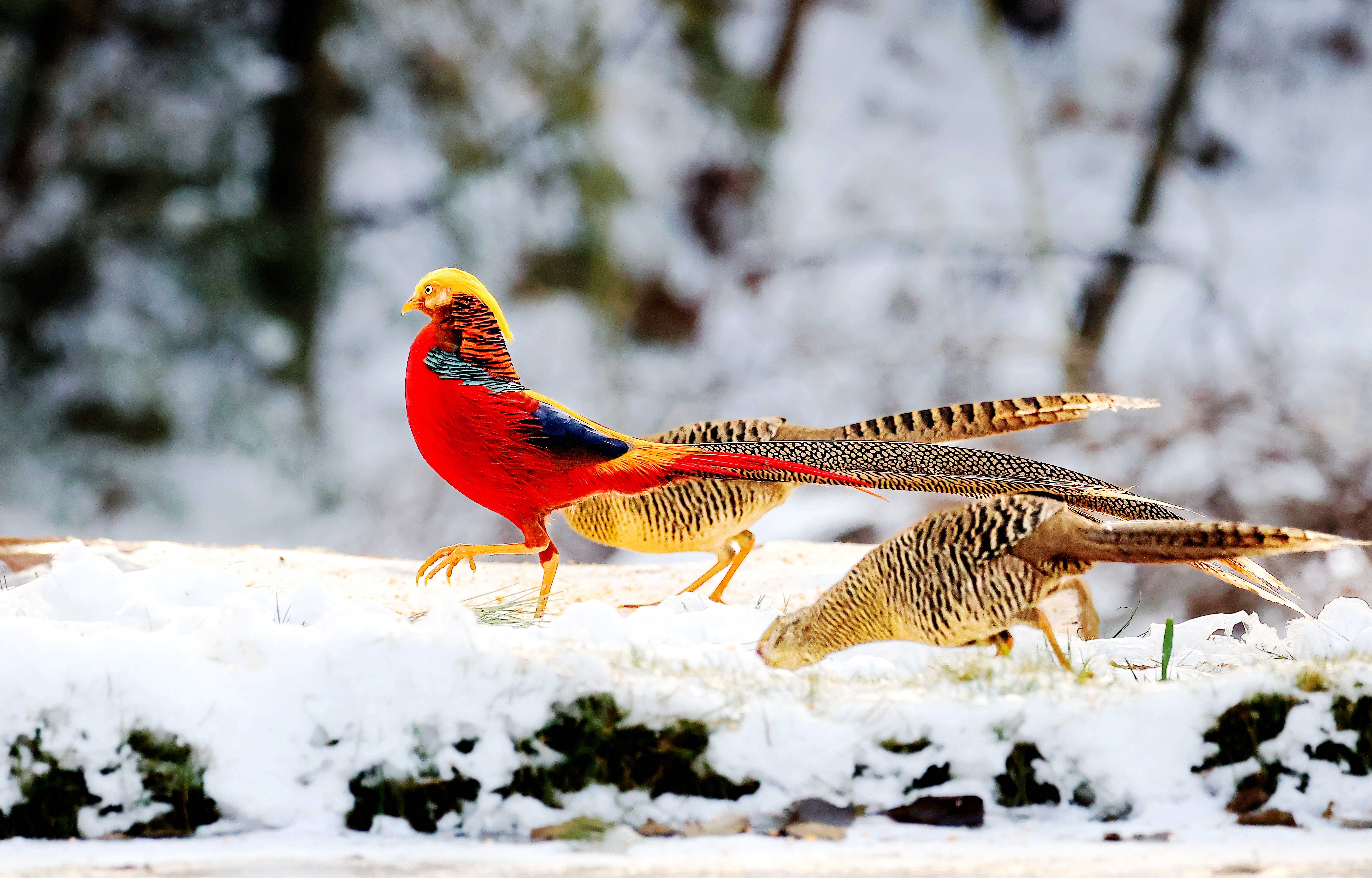 新年首场瑞雪过后,禹州市磨街乡大涧村村南的牛头山银装素裹,万籁俱寂。山间空地上,色彩斑斓的红腹锦鸡格外惹眼,它们身披赤、橙、黄、绿、青、蓝、紫七色羽毛,或低头觅食,或嬉戏追逐,为静谧的雪色山林注入灵动生机。