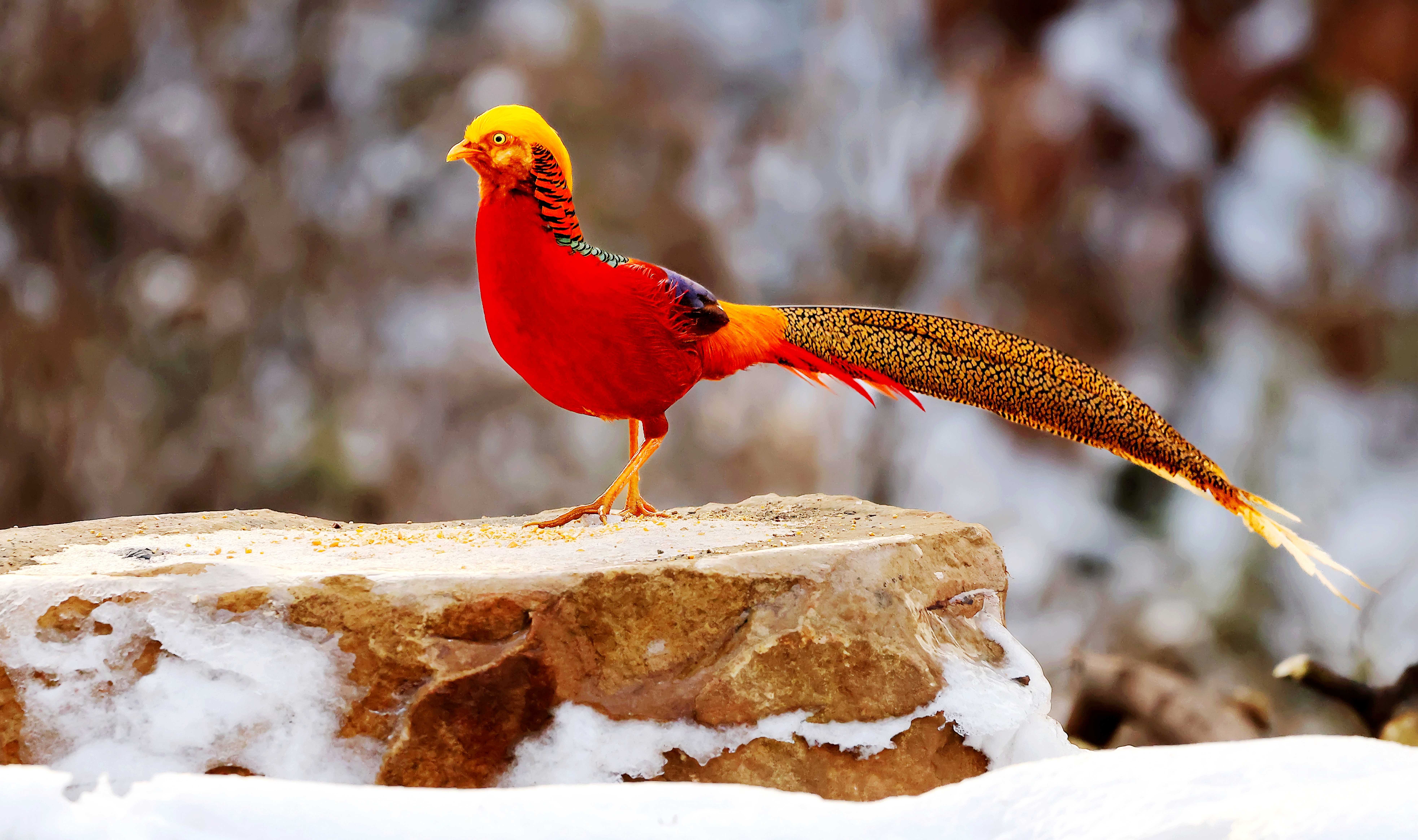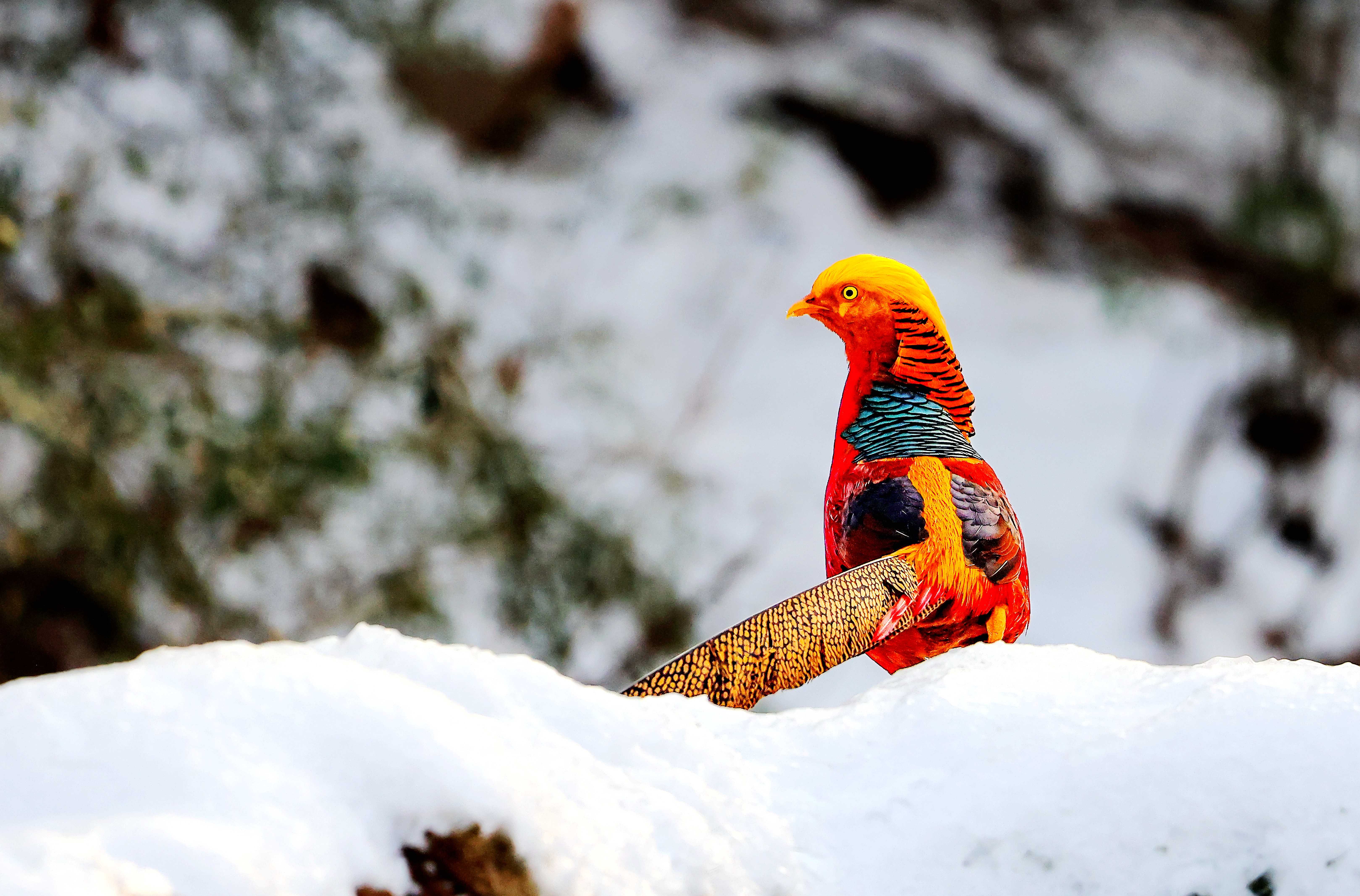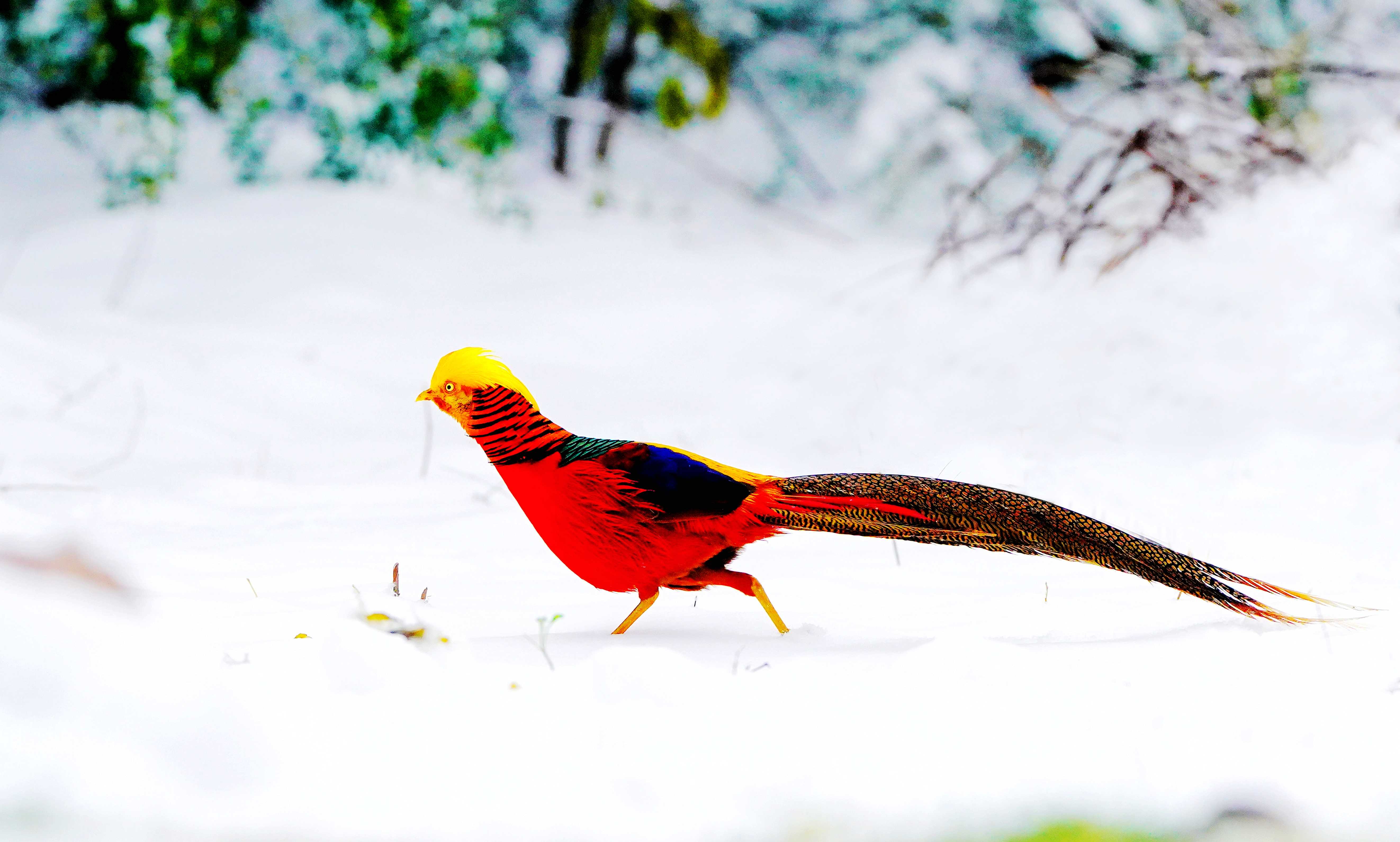 新年首场瑞雪过后,禹州市磨街乡大涧村村南的牛头山银装素裹,万籁俱寂。山间空地上,色彩斑斓的红腹锦鸡格外惹眼,它们身披赤、橙、黄、绿、青、蓝、紫七色羽毛,或低头觅食,或嬉戏追逐,为静谧的雪色山林注入灵动生机。