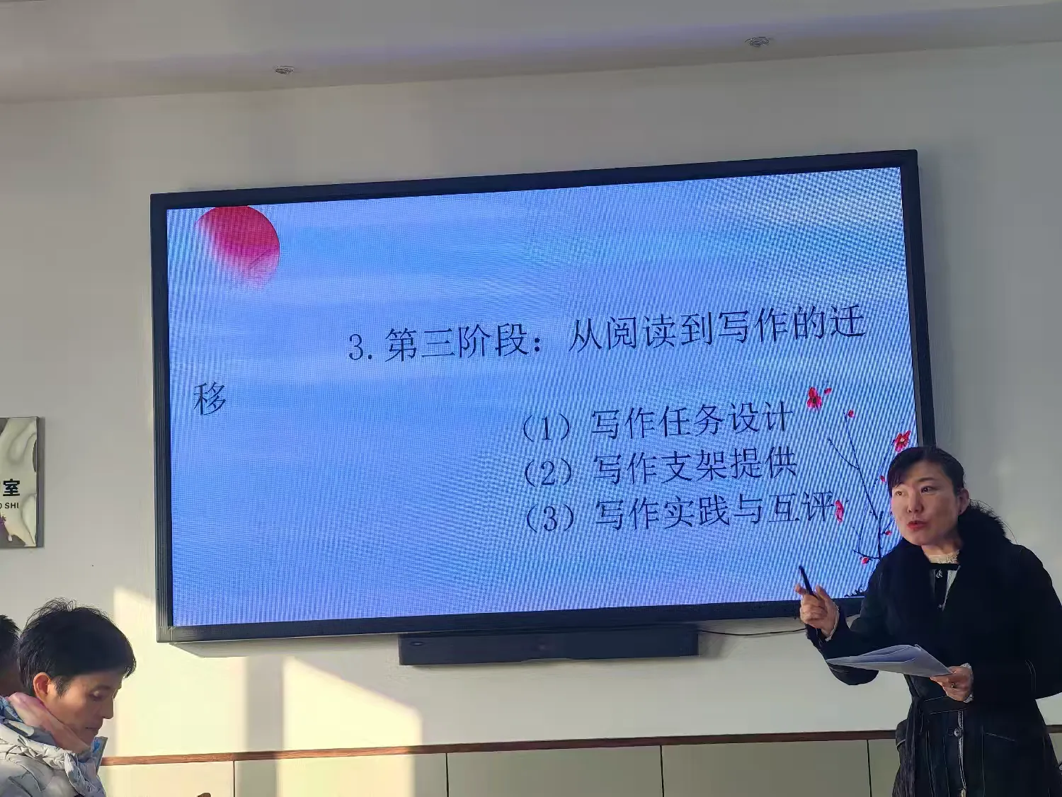 教研活动伊始,聚焦“写作教学提质”核心议题,一场循序渐进的写作策略分享率先登场。从创意启发的灵感唤醒,到素材积累的方法沉淀,再到技巧指导的精准落地,张丽老师以清晰的进阶逻辑,拆解写作教学的关键环节,为在场教师提供了可操作、可迁移的实践方案。无论是激发学生表达欲的创意活动设计,还是帮助学生搭建素材库的实用技巧,都让在场教师深受启发,为破解写作教学中的痛点难点提供了新的思路。