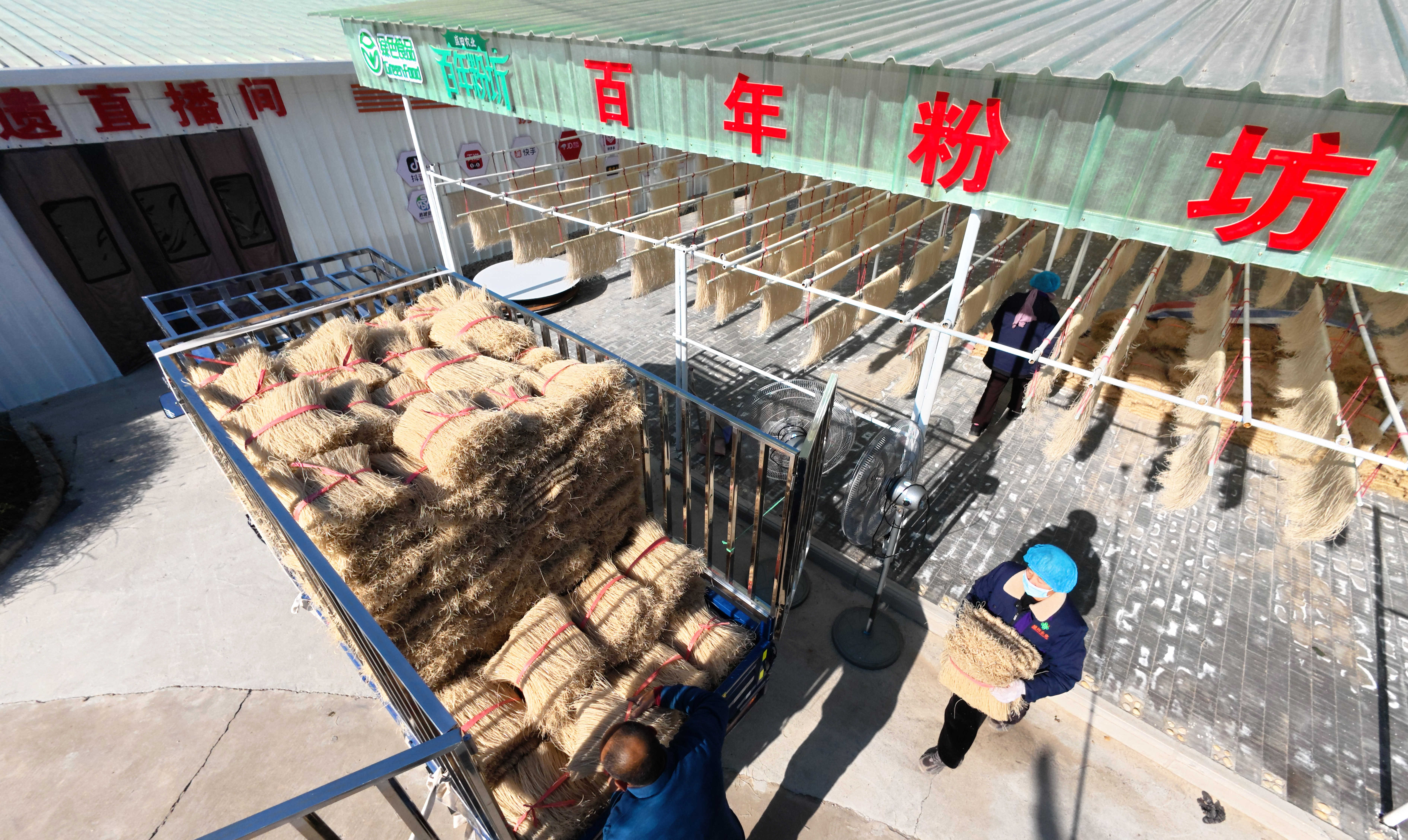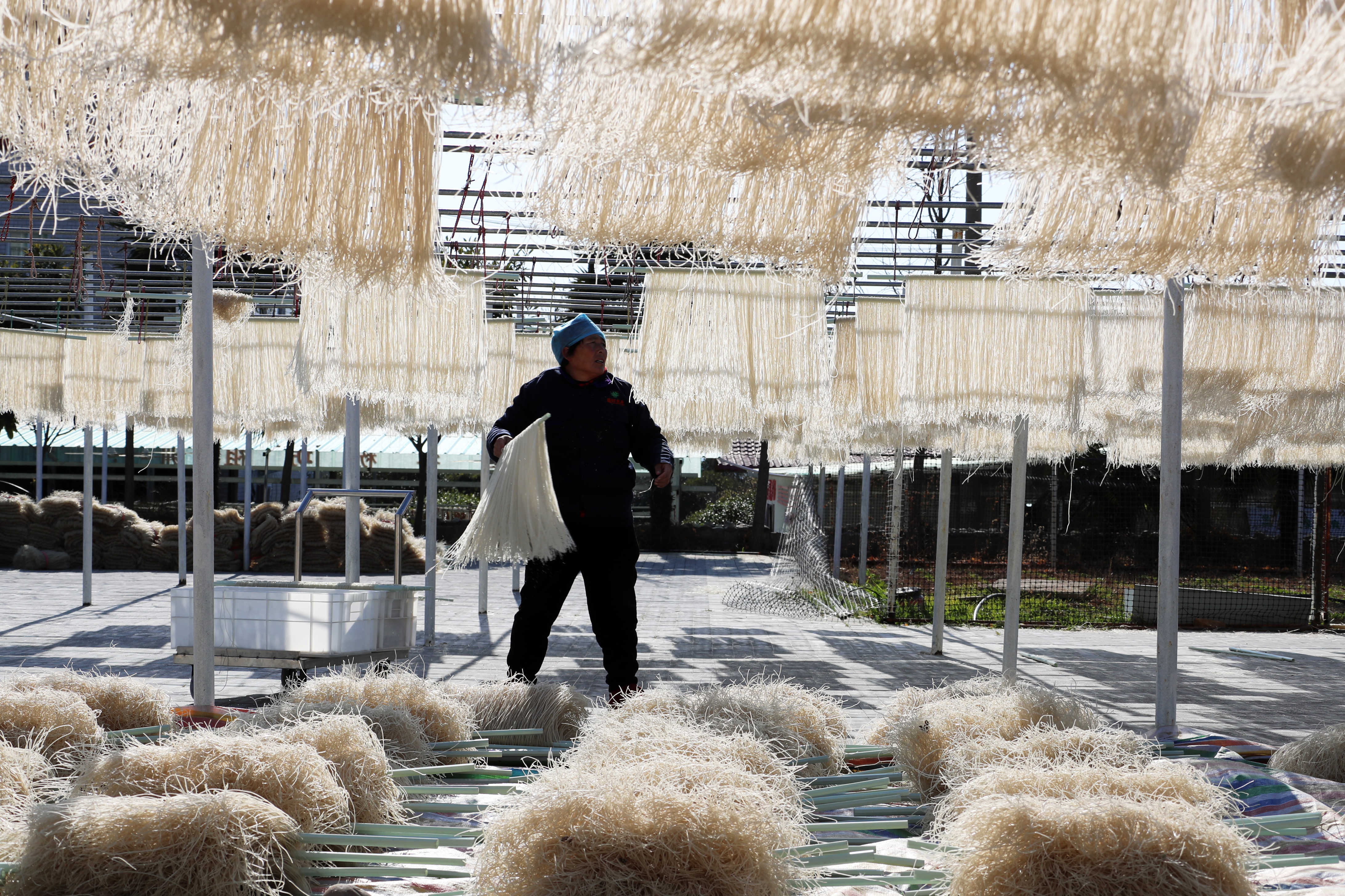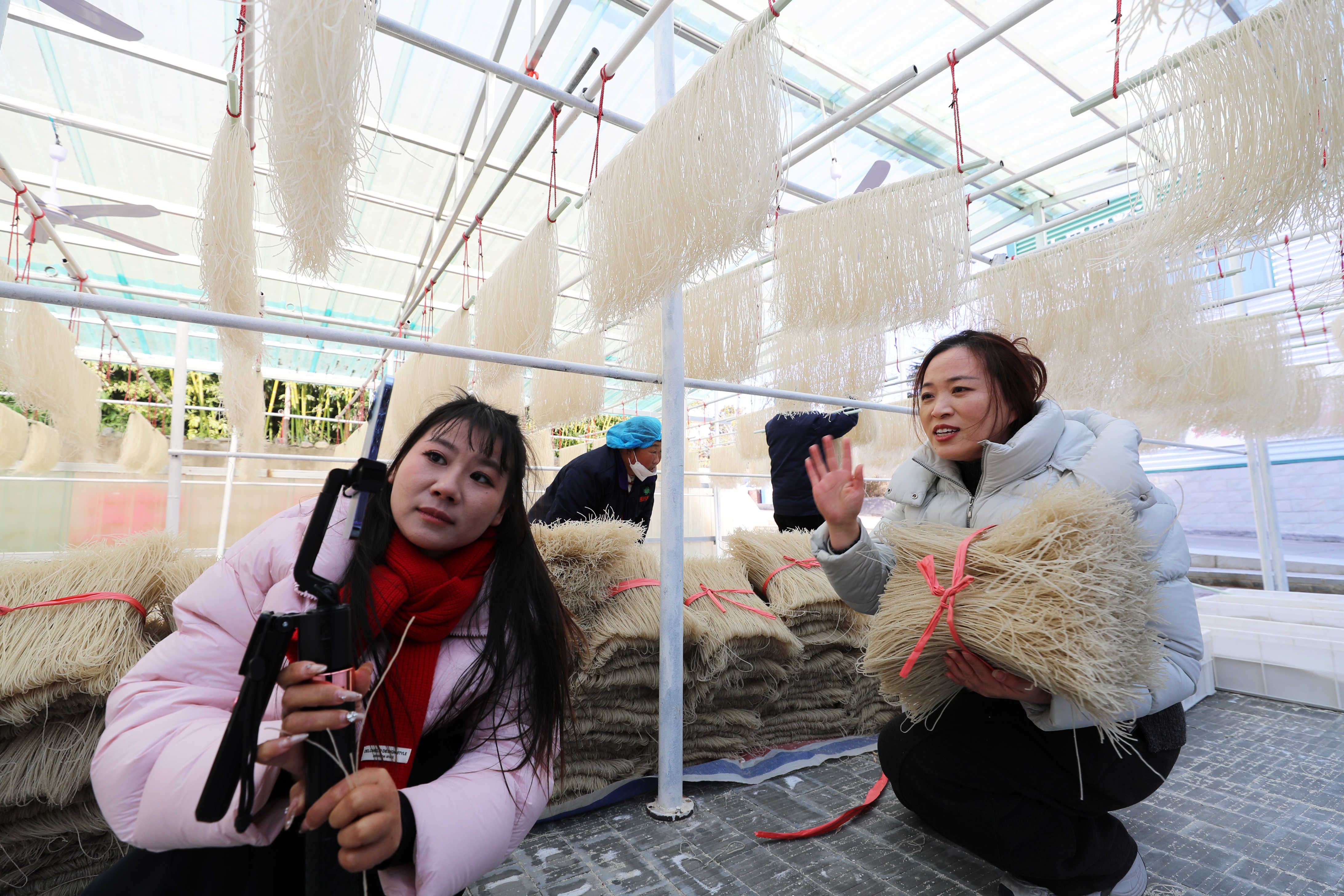 村民在位于禹州市朱阁镇北郝庄村的河南省盛田农业有限公司收获晾晒后的红薯粉条。