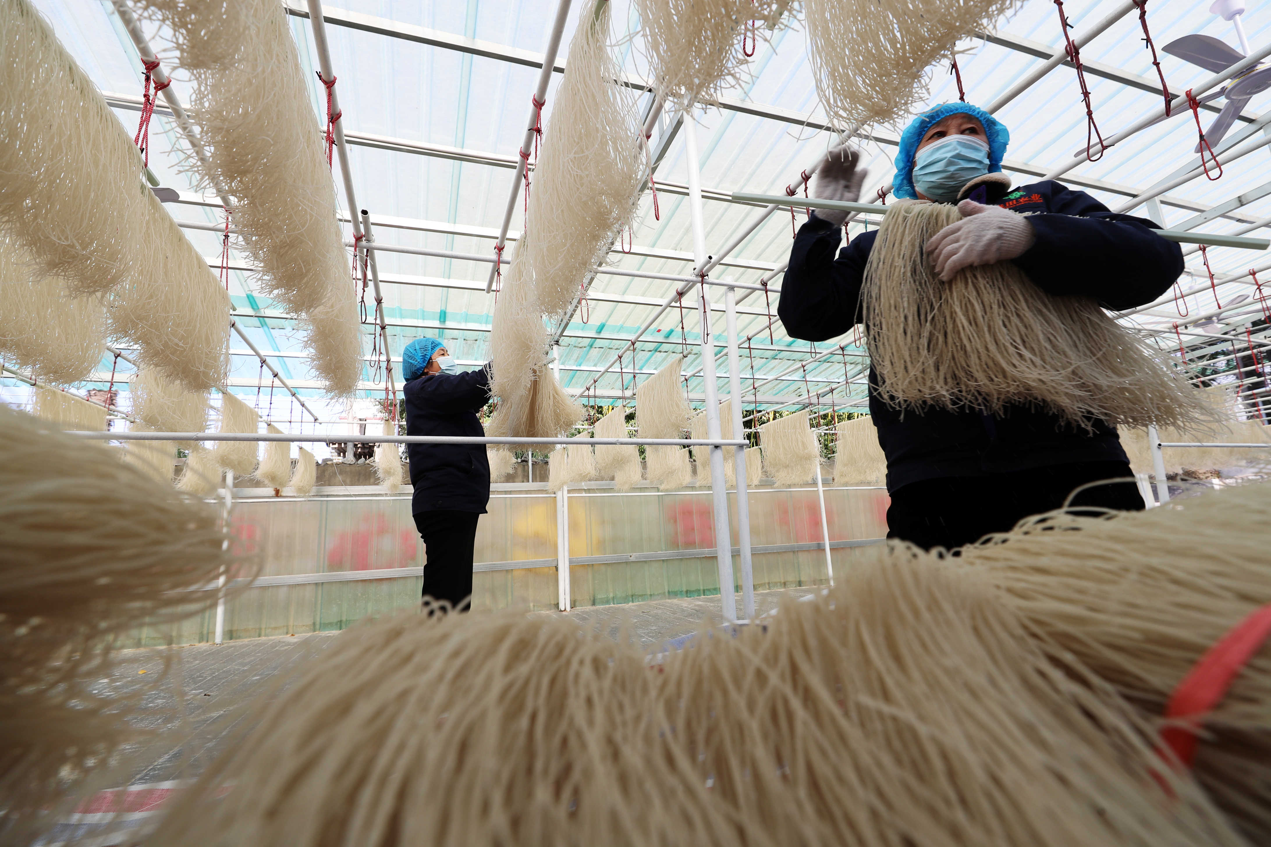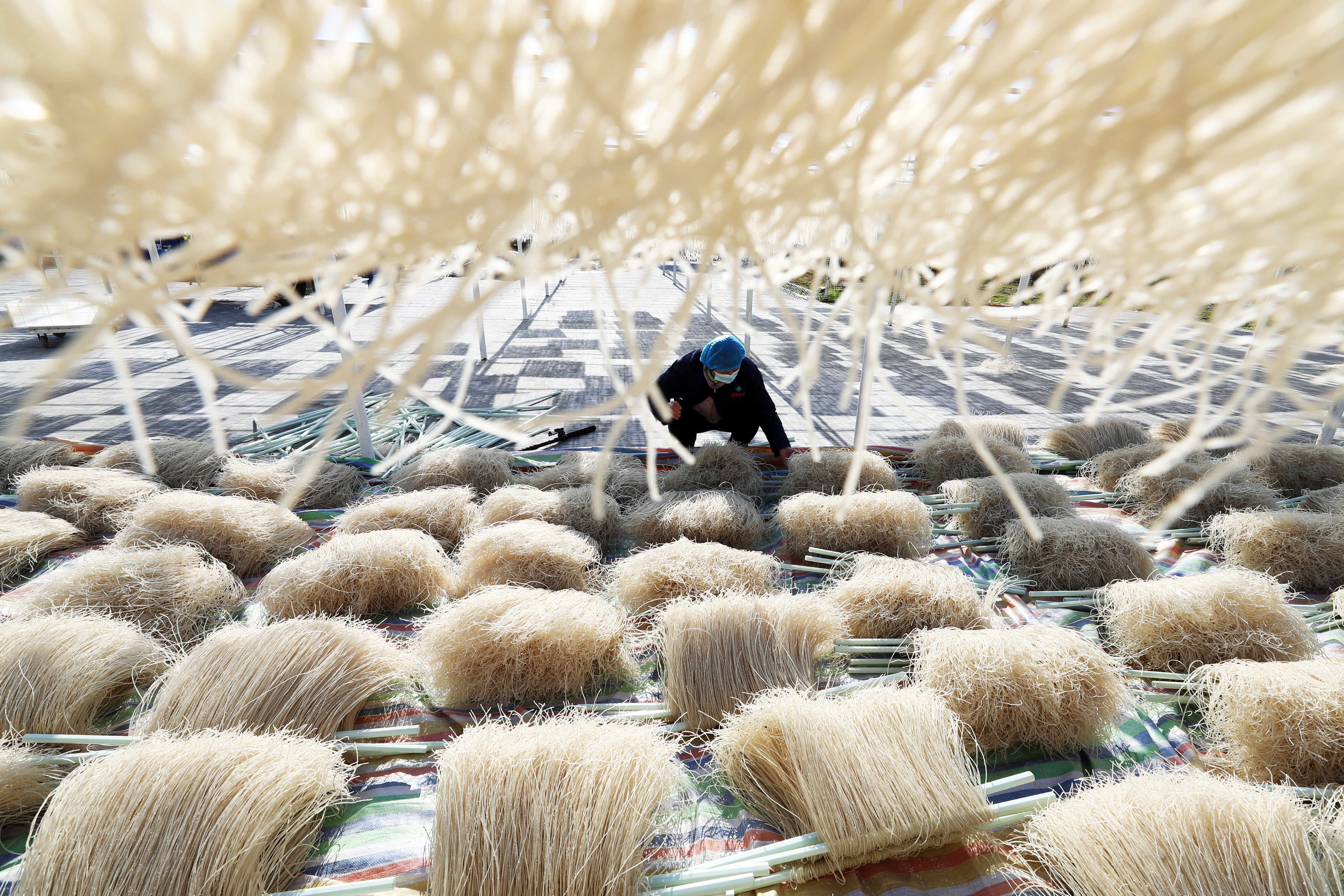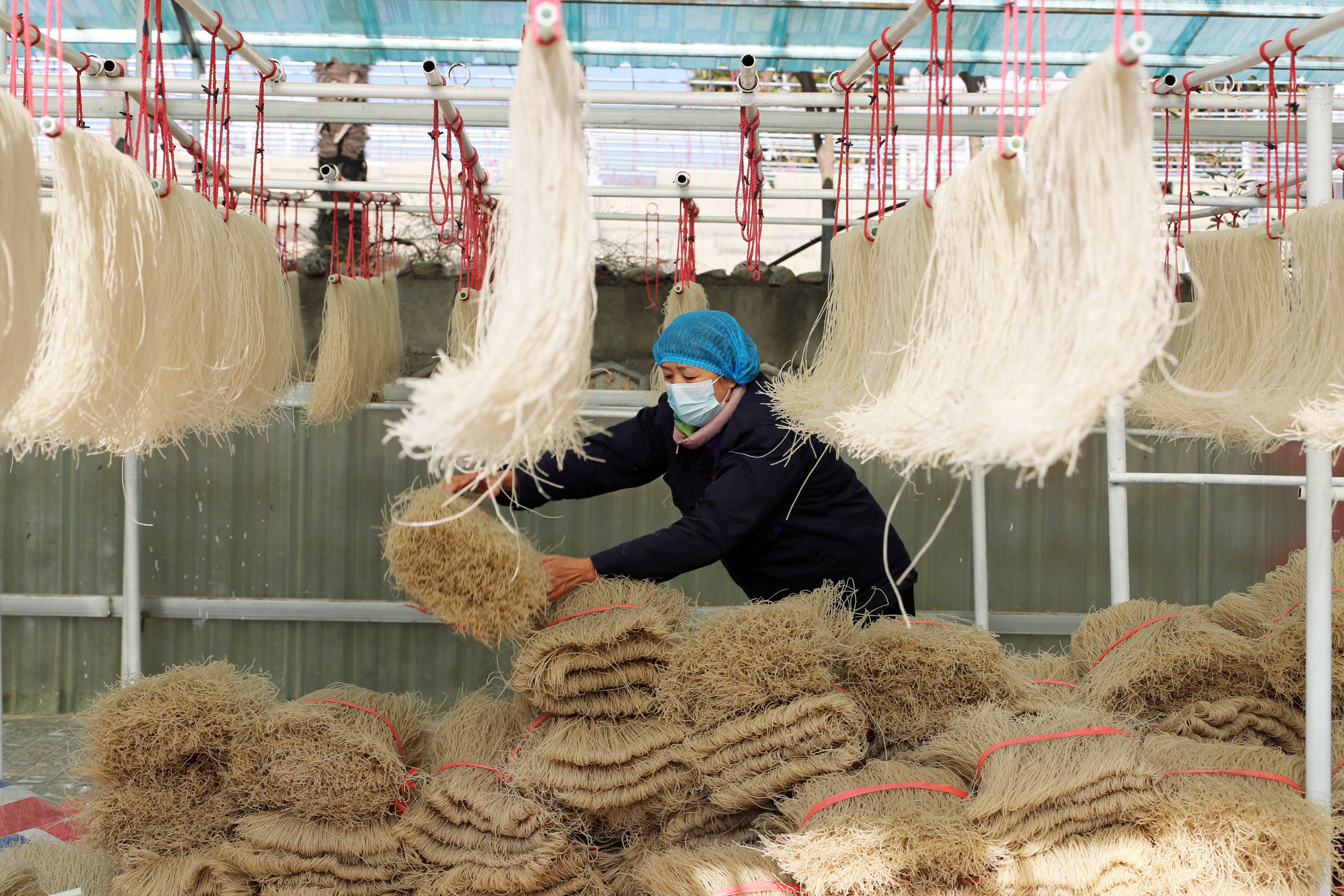 村民在位于禹州市朱阁镇北郝庄村的河南省盛田农业有限公司收获晾晒后的红薯粉条。