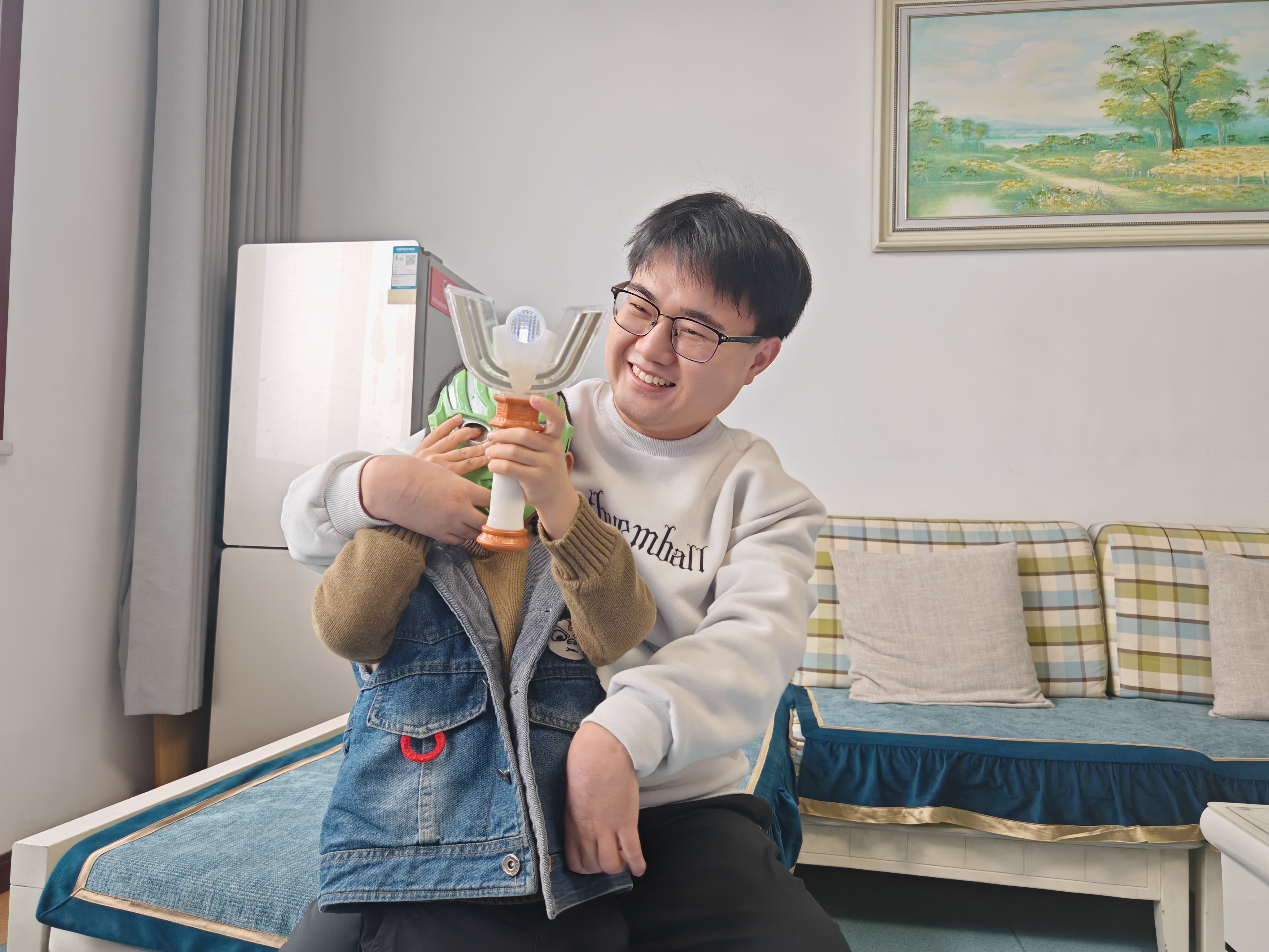 “哥哥,快来和我玩奥特曼。”刚放下作业本,许改请就被小园拉着手来到客厅沙发上坐下,他拿起绿色的奥特曼面具,仔细调整好绑带,小心翼翼地帮小园戴在脸上,开心的笑声在客厅里回荡。
