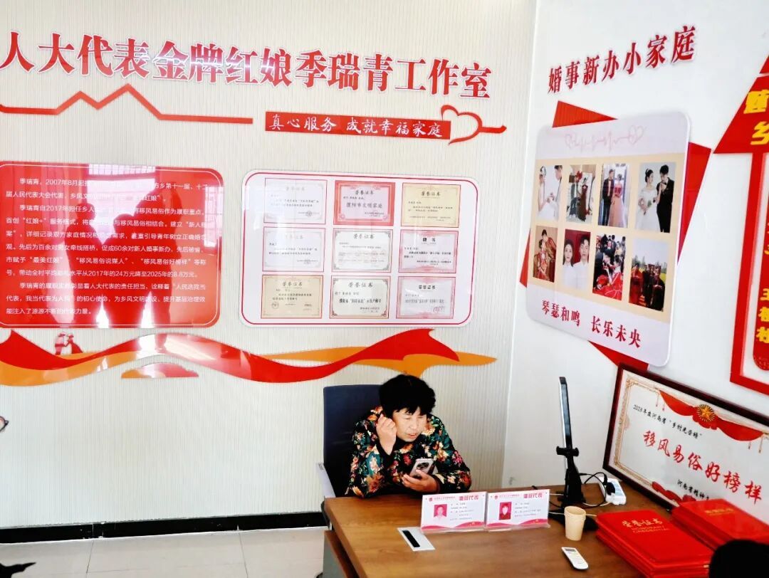 一天工作忙完,已近傍晚。季瑞青打开办公桌上的支架,登录直播间,小红心争着往外跑。她的直播间不卖货,只“卖”大白话:讲红娘、党员干部很关键,红娘要心里有准绳、压价有办法,铺张浪费的婚礼村干部不应该到场;讲彩礼本质上就是个“彩头”,把彩礼变成“扶贫款”“爱情考试”,那就变味了。