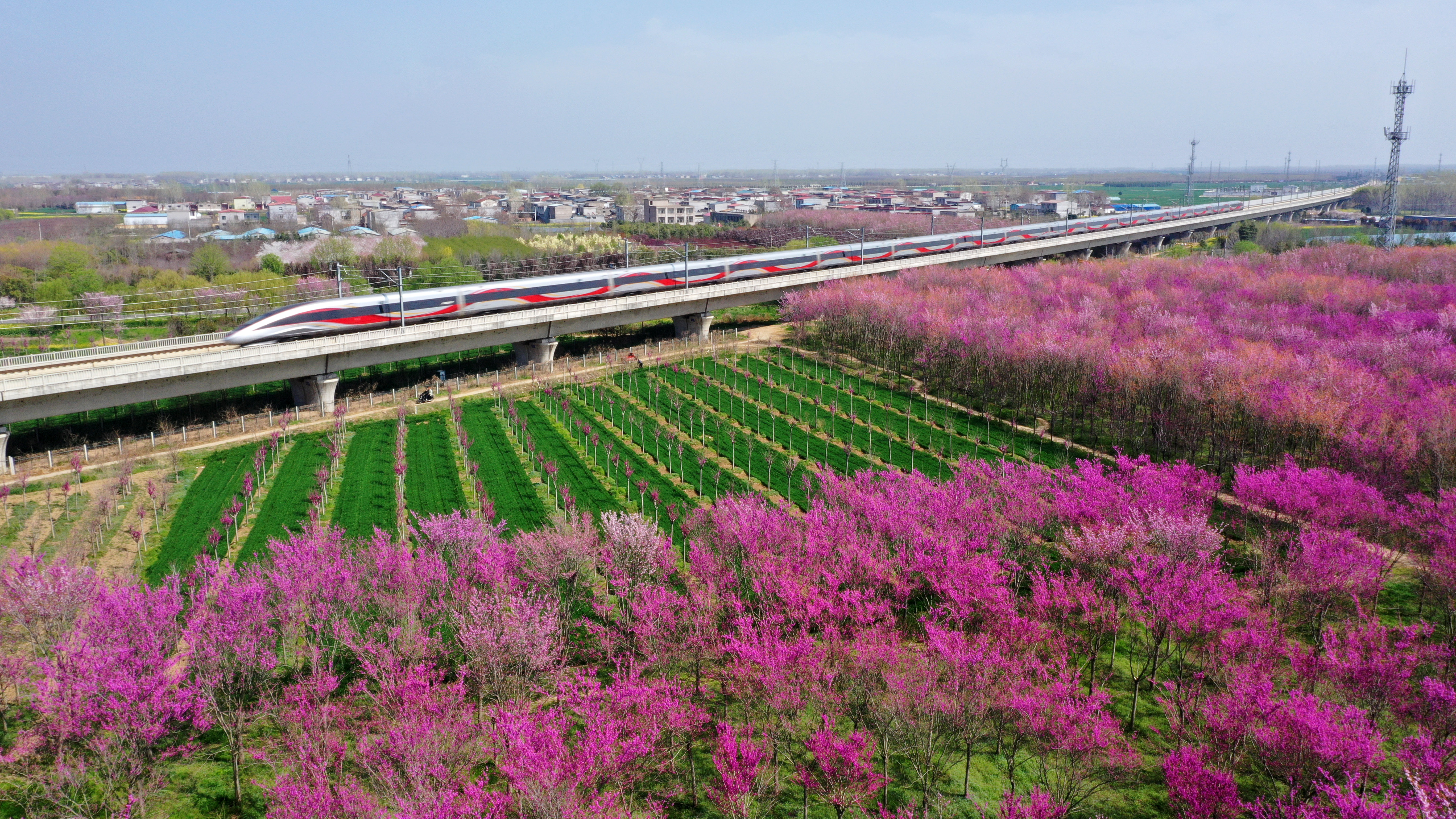 3月28日,高铁列车从建安区小召乡紫荆花海中驶过(无人机照片)。